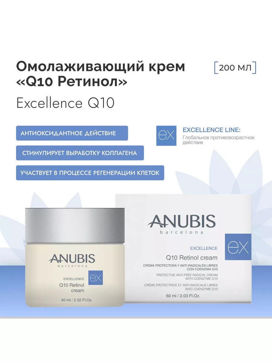 Excellence Q10 Retinol Cream, 60 ml. A restorative antioxidant cream with ubiquinone and retinol. Contains vitamins and moisturizing agents, it restores the skin's protective hydrolipidic layer. Coenzyme Q10 activates cellular energy and neutralizes free radicals. The effect of coenzyme Q10 is enhanced by vitamins A, C, E, and B3, which stimulate the production of collagen and elastin, necessary for tissue regeneration. Contains PCA, a component of the natural moisturizing factor, as well as an SPF 6 UV filter. HOW TO USE: Apply the cream to dry, cleansed skin with light massage movements. Anubis Barcelona is a professional, premium-quality aesthetic brand that uses advanced patented formulas and proprietary synergy. Made in Barcelona, Spain. Anubis Barcelona products are completely safe and approved for use during pregnancy and lactation. They do not disrupt the skin's hydrolipid balance and do not "roll back" the epidermis's condition to its initial state when you stop using cosmetics.