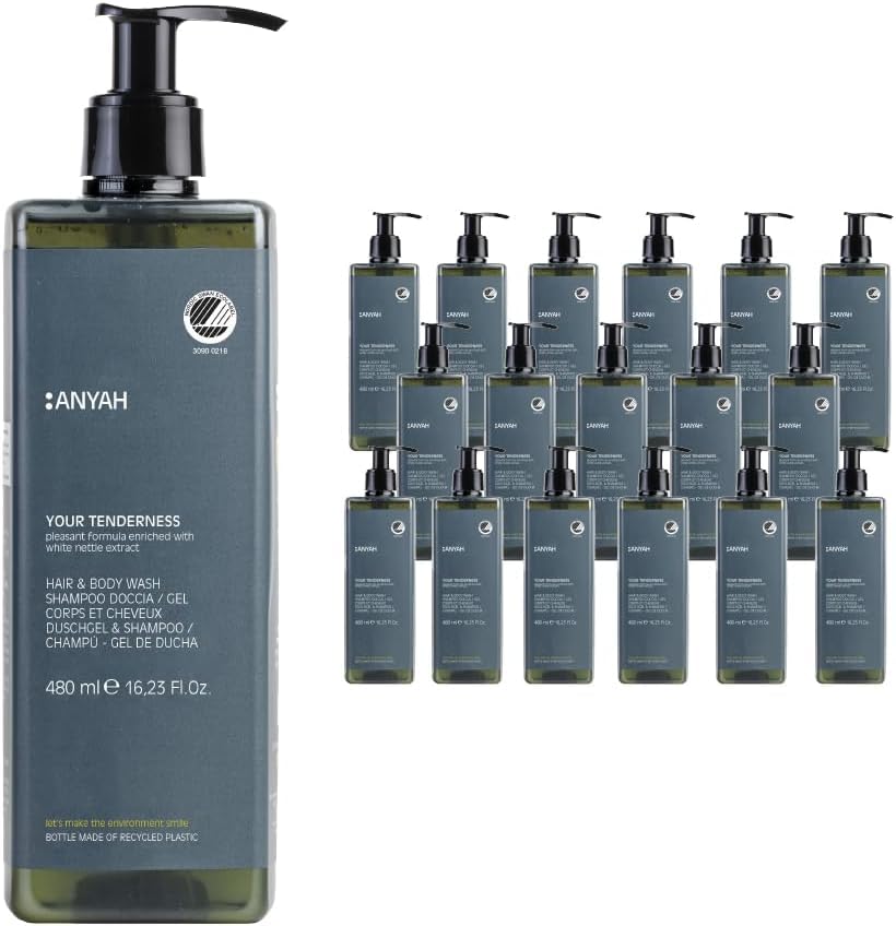 2-in-1 Gentle Shower Gel and Shampoo for Body and Hair ANYAH Gentle Shower Gel and Shampoo is designed to provide effective and gentle cleansing for the body and hair. Ideal for daily use, it combines practicality, care, and sustainability in one step. With soothing white nettle extract. Enriched with white nettle extract, this shower gel and shampoo helps purify and balance the skin and scalp, leaving a pleasant feeling of natural freshness. Clean, vegan, and certified formula. - Vegan formula: no animal-derived ingredients. - Ecolabel certified: guaranteed commitment to the environment. - Dermatologically tested: suitable for all skin and hair types. Sustainable packaging. The 480 ml bottle is made from post-consumer recycled (PCR) plastic to reduce environmental impact without compromising quality. Why choose ANYAH? 2-in-1 shower gel and shampoo: practical and versatile. Perfect for home, travel, hotels, and spas. Free from silicones, parabens, synthetic dyes, and alcohol. Made in Italy with care for your well-being and the environment. Treat yourself to a moment of mindful care every day with Anyah Gentle Shower Gel and Shampoo. INGREDIENTS Water, Sodium Lauryl Sulfate, Cokhidopropyl Betaine, Betaine, Sodium Chloride, Sodium Benzoate, Citric Acid, Coconut Glycol, Glycyloid, Glycyl Oil, Fragrance, Potassium Surfactant, Propylene Glycol. WHITE NETTLE EXTRACT (LAMIUM ALBUM), TOCOPHEROL, HYDROGENATED PALM GLYCREED CITRATE, CI 19140 (YELLOW 5), CI 16035 (RED 40), CI 42090 (AZUL 1). (CPNP 00ED_R11) DIRECTIONS Apply to the body and hair and rinse thoroughly. Repeat if desired. SAFETY WARNING External use only. Do not ingest. Keep away from the mouth, nose, and other mucous membranes. See moreMADE IN ITALY - 100 RECYCLED BOTTLE: Product designed and manufactured in Italy according to high quality standards. Recyclable packaging made from 100 recycled plastic. Eco-certified: Eco-friendly and vegan formula with European Ecolabel certification. Not tested on animals and suitable for a vegan lifestyle. Dermatologically tested: Suitable even for sensitive skin. Free from parabens, BHT, silicones, and artificial colors. Dermatologically tested to guarantee high tolerance. MOISTURIZING FORMULA WITH WHITE NETTLE: Contains white nettle extract, known for its soothing and purifying properties. Leaves skin soft and hair clean and revitalized. 2-in-1 body and hair care: Shower gel and shampoo combined, perfect for daily use. Gently cleanses skin and hair while respecting their natural balance.ANYAH Gel douche et shampooing 2 en 1 - 18 x 480 ml - Gel de bain délicat à l'ortie blanche - Savon corps végétalien - Certifié EcolabelDESCRIPTION DU PRODUIT DESCRIPTION DU PRODUIT Gel douche et shampooing doux 2 en 1 pour le corps et les cheveux ANYAH Gel douche et shampooing doux est conçu pour offrir un nettoyage efficace et délicat du corps et des cheveux. Idéal pour un usage quotidien, il allie praticité, soin et durabilité en un seul geste. Avec extrait d'ortie blanche à action apaisante. Enrichi en extrait d'ortie blanche, ce gel douche et shampooing aide à purifier et à équilibrer la peau et le cuir chevelu, laissant une agréable sensation de fraîcheur naturelle. Formule propre, végétalienne et certifiée. - Formule végétalienne : sans ingrédients d'origine animale. - Certifié Ecolabel : engagement garanti envers l'environnement - Testé dermatologiquement : convient à tous les types de peau et de cheveux. Emballage durable. Le flacon de 480 ml est fabriqué en plastique recyclé post-consommation (PCR), pour réduire l'impact environnemental sans compromettre la qualité. Pourquoi choisir ANYAH ? Gel douche et shampooing 2 en 1 : pratique et polyvalent. Parfait pour la maison, les voyages, les hôtels et les spas Sans silicones, parabènes, colorants synthétiques ni alcool. Fabriqué en Italie avec soin du bien-être et de l'environnement. Offrez-vous un moment de soin conscient chaque jour avec Anyah Gel Douche et Shampooing Doux. INGRÉDIENTS Eau, lauryl sulfate de sodium, cokhidopropyl bêta, bêta-ïne, chlorure de sodium, benzoate de sodium, acide citrique, noix de coco, glycoide, huile de glycylle, parfum, surbat de potassium, propylène glycol. EXTRAIT DE ORTIE BLANCHE (LAMIUM ALBUM), TOCOPHÉROL, CITRATE DE GLYCRÈDES DE PALME HYDROGÉNÉS, CI 19140 (JAUNE 5), CI 16035 (ROUGE 40), CI 42090 (AZUL 1). (CPNP 00ED_R11) MODE D'EMPLOI Appliquer sur le corps et les cheveux et rincer abondamment. Répéter si désiré. AVERTISSEMENT DE SÉCURITÉ Usage externe : pour usage externe uniquement. Ne pas ingérer. Tenir à l'écart de la bouche, du nez et d'autres muqueuses. Voir plusFABRIQUÉ EN ITALIE - BOUTEILLE 100 RECYCLÉE : Produit conçu et fabriqué en Italie selon des normes de qualité élevées. Emballage recyclable fabriqué à partir de plastique 100 recyclé. Certificat écologique : formule écologique et végétalienne avec certification européenne Ecolabel. Non testé sur les animaux et adapté à un mode de vie végétalien. Testé dermatologiquement : convient même aux peaux sensibles. Sans paraben, BHT, silicones et colorants artificiels. Testé dermatologiquement pour garantir une haute tolérance. FORMULE HYDRATANTE À L'ORTIE BLANCHE : Contient de l'extrait d'ortie blanche, connu pour ses propriétés apaisantes et purifiantes. Laisse la peau douce et les cheveux propres et revitalisés. Soin 2 en 1 pour le corps et les cheveux : gel douche et shampooing combinés, parfaits pour un usage quotidien. Nettoie en douceur la peau et les cheveux tout en respectant leur équilibre naturel.