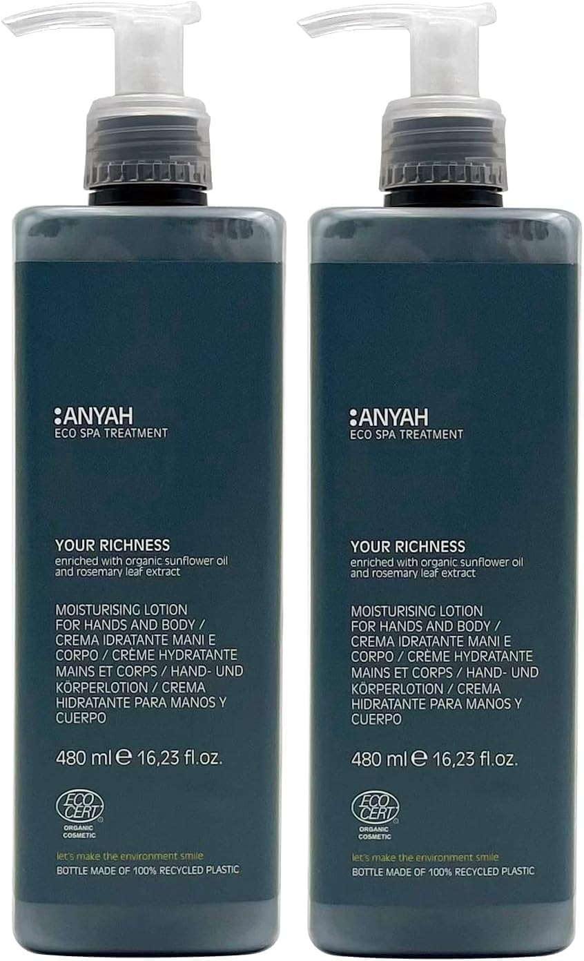 universal application: This moisturizer for hands and body is suitable for all skin types and ensures a revitalized and hydrated skin.Made in Italy: Each bottle is carefully manufactured and packed in Italy to guarantee the highest quality standards.Sustainable and practical: The 2x480ml pack comes in refillable bottles so that you can continue to use your favorite handicraft and body lotion in an environmentally conscious way.Organic ingredients: enriched with organic seed oil and rosemary extract, this moisturizer maintains your skin natural and effectively.Ideal for comprehensive hand care and body care.High-quality wording: Our Anyah hand and body lotion is dermatologically tested and ensures long-lasting moisture.Perfect as a skin cream and body cream for everyday use.