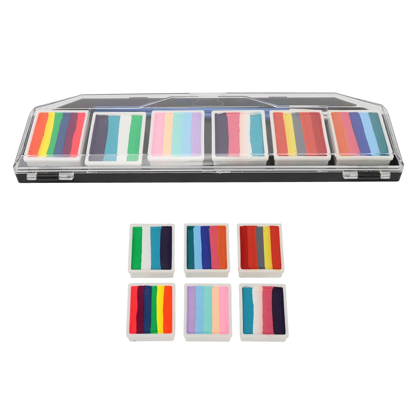 Dries quickly: The water-soluble paint dries in about 1 minute and won't drip, preventing the embarrassment of discoloration and ensuring a long-lasting effect. Wide application: Can be used for body painting, face painting, Halloween, Christmas, cosplay, parties, stage art, DIY painting, painting classes, and more. Safe to apply: Safe and colorful palette, compliant with makeup standards, odorless and low-allergy, suitable for children and adults, and harmless to the skin. Water-based: The water-based body paint pigments are activated by water and can be applied with a brush, making it simple, convenient, and easy to use. Easy to clean: Easy to clean with water or a damp cloth without leaving marks. A palette of multi-colored plates with vibrant, rich colors, easily handling complex designs.