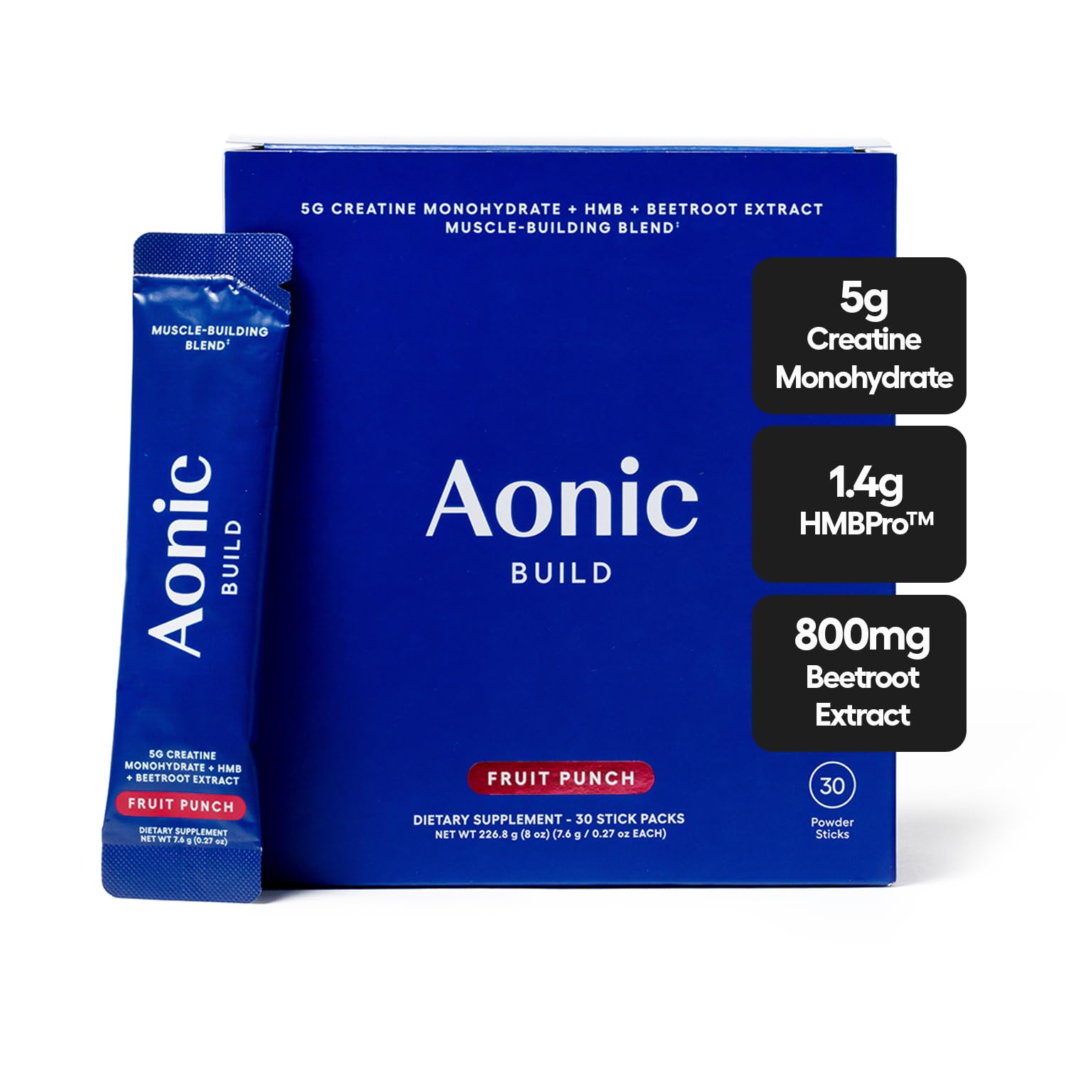 AONIC Build 3-in-1 Creatine HMBPro & Beetroot Formula | Vegan Non-GMO Pre/Post-Workout Drink Mix Fruit Punch (30 Sticks)