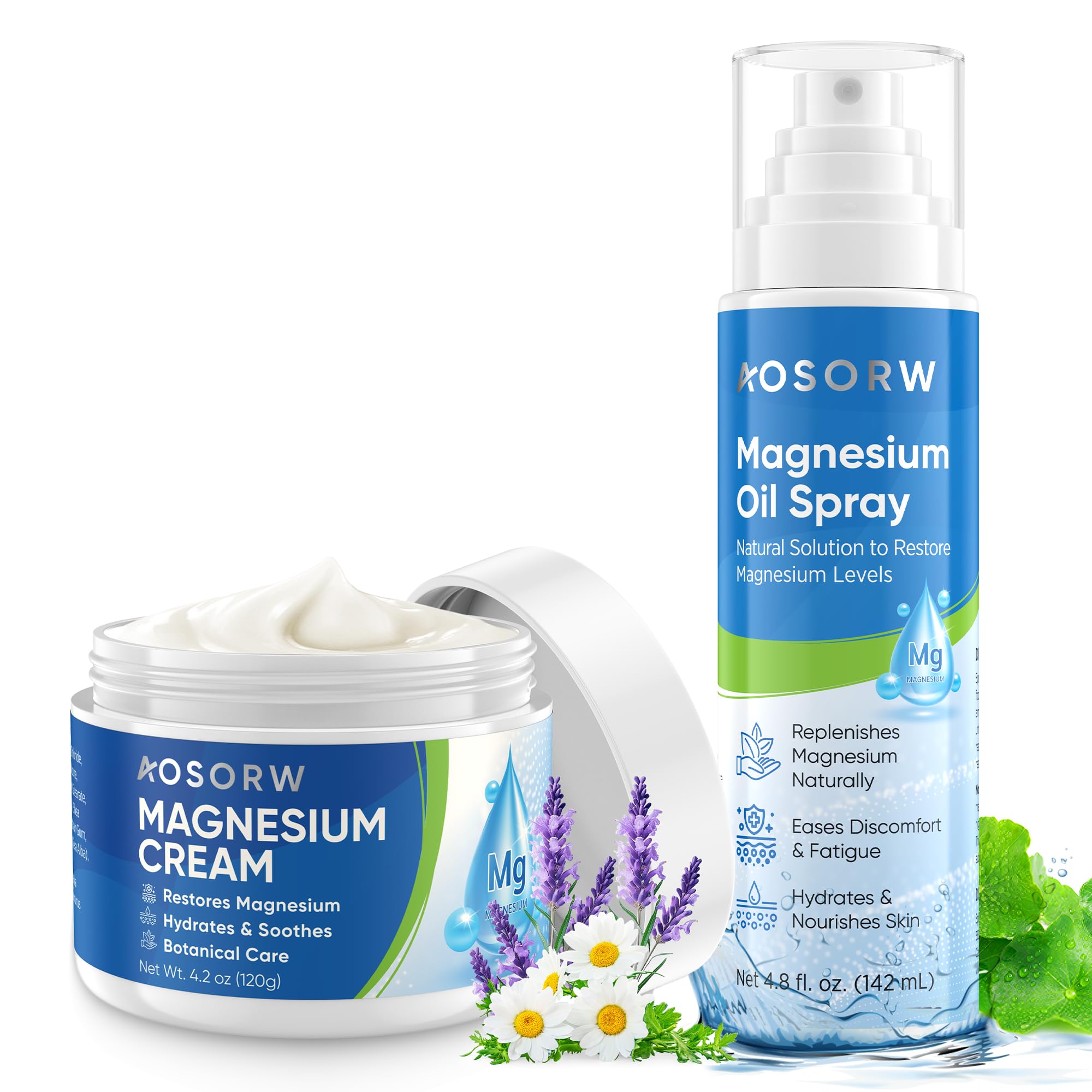 Experience the ultimate topical magnesium therapy with this AOSORW bundle, combining a fast-absorbing Magnesium Cream and a lightweight Magnesium Oil Spray. Formulated with natural magnesium chloride and botanical extracts, this duo helps replenish magnesium levels, relieve muscle and joint tension, and promote restful sleep. The cream deeply hydrates and comforts skin with hyaluronic acid, vitamin E, and essential oils, while the spray delivers instant relief and refreshment—ideal for post-workout use or bedtime relaxation. Both products are non-greasy, fast-absorbing, and crafted with clean, skin-friendly ingredients for daily comfort and recovery.