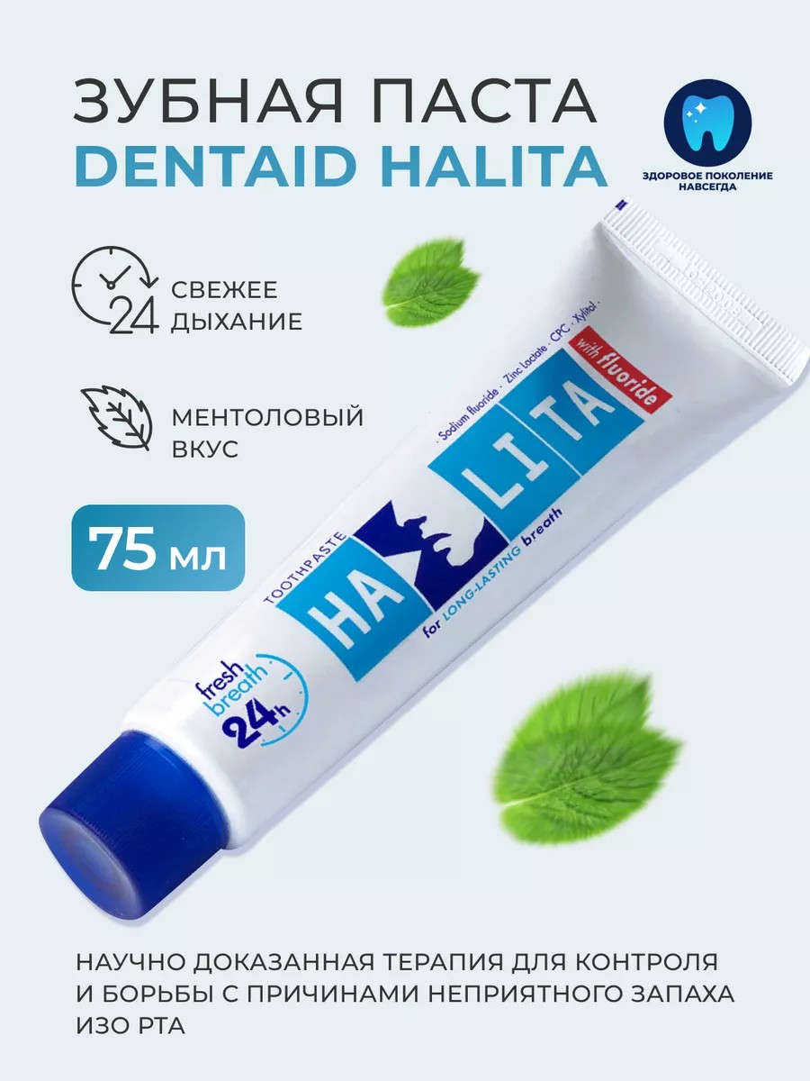 Зубная паста Halita с фтором первая научно доказанная терапия для контроля и борьбы с причинами неприятного запаха изо рта. Неприятный запах изо рта - Галитоз вызван избытком анаэробных бактерий, которые производят летучие соединения серы VSC (газы с неприятным запахом, полученные из белков слюны, неправильное питание).Ежедневное использование фторсодержащей зубной пасты Halita устраняет неприятный запах изо рта и освежает дыхание. Благодаря специальной формуле паста также защищает зубы и десны. Хлорид цетилпиридина и ксилит борются с газами, вырабатываемыми бактериями во рту. Кроме того, ксилит предотвращает кариес и увлажняет полость рта. Лактат цинка дезактивирует бактерии во рту, ответственные за VSC, и блокирует их распространение во рту. Антибактериальный ингредиент, подавляет образование зубного налета. Фторид натрия предотвращает кариес. Зубная паста Halita с фтором 75мл.Dentaid Halita зубная паста с фтором 75 мл превосходно справляется с нейтрализацией летучей серы в полости рта. При этом Dentaid Halita, эффективно защищает десна и надежно борется с налетом. Подходит к ежедневному применению, рекомендована к использованию после каждого приема пищи. Не рекомендуется детям до 8 лет.