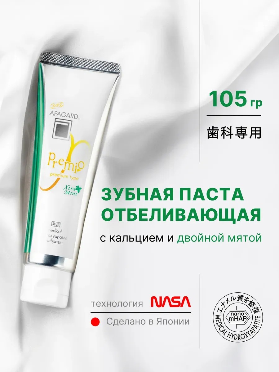 refreshing double-mint toothpaste from Japan, 105g. With regular use, Apagard Premio Xtra mint effectively combats bad breath, strengthens and brightens enamel, restores a beautiful shine, reduces tooth sensitivity, provides effective caries prevention, and protects against tartar. This fluoride-free, SLS-free toothpaste is recommended for adults and teenagers. This professional toothpaste contains pearl extract and Medical Nano-Hydroxyapatite (nano-mHAP), a joint development of Japanese scientists and NASA. It is a synthetic analogue of biological hydroxyapatite, a mineral that makes up 97% of tooth enamel and 70% of dentin. Thanks to its nano-sized particles (up to 50 nm), it easily integrates into microdamages in the enamel and dentinal tubules. Nanoparticles penetrate deep into the enamel structure and restore it from within, resulting in smooth, shiny teeth that can lighten a few shades. Medical-grade Nano-Hydroxyapatite is compatible with human bones and teeth, helping with enamel mineralization (the process of saturating enamel with minerals), preventing the development of caries and combating it at the white spot stage. Calcium Hydrogen Phosphate effectively removes nicotine plaque from the surface of teeth and cleanses enamel from dark stains from coffee and tea. Silicic anhydride gently cleanses and polishes tooth enamel, Cetylpyridinium chloride moisturizes the oral mucosa, has anti-inflammatory and bactericidal properties, and Beta-glycyrrhizic acid has an active antimicrobial and anti-inflammatory effect. The toothpaste also contains pearl extract, which gives enamel a healthy and beautiful shine. Suitable for smokers. Directions: Apply a small amount of toothpaste to your toothbrush. Brush your teeth with gentle, massaging movements for 3 minutes. Rinse your mouth. Suitable for daily use.