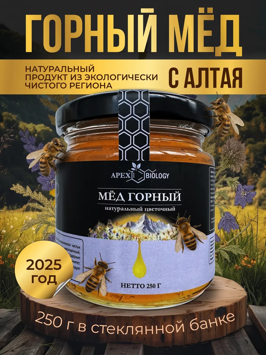 Натуральный горный мёд APEX BIOLOGY — это не просто лакомство, а истинное воплощение природы, заботы и здоровья в каждой ложке. Собранный в экологически чистых предгорьях Алтайского края, среди диких трав и цветков, этот настоящий мёд вобрал в себя силу и энергию гор. Такой медовый сбор доступен лишь немногим — и вы держите в руках именно то, что стоит попробовать хотя бы раз в жизни.