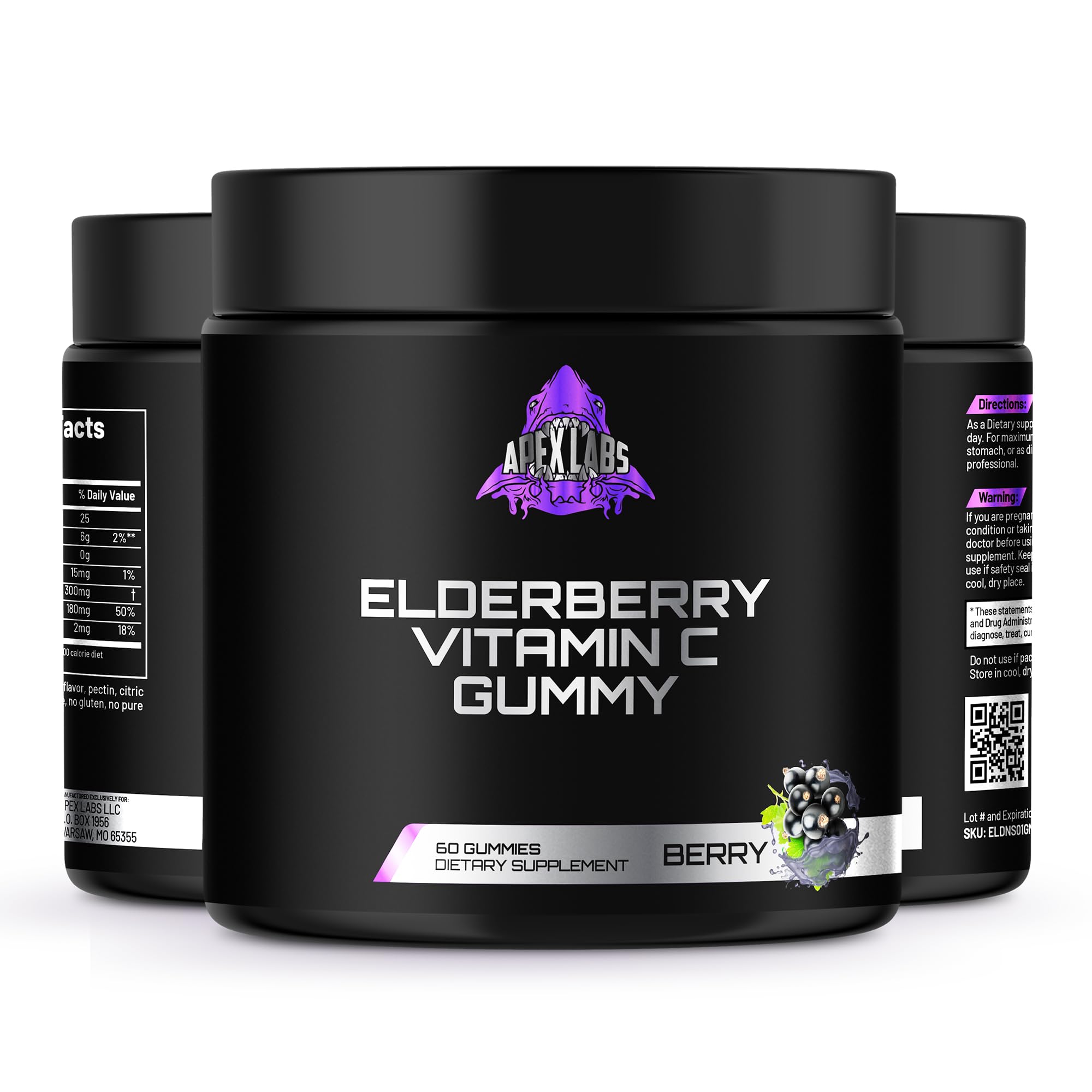 MIX AND MATCH: Delightful and delicious Apex Labs products can be taken together—mix and match as you please. NATURALLY DELICIOUS: A bright blend of Elderberry, Blackberry Strawberry. 60 gummies per bottle (30-day supply). HOW TO TAKE: Chew two gummies per day as needed. No food or water needed. THE GOODS INSIDE: Elderberry supports immune health and packs a powerful punch of phytonutrient plant power. Vitamins C, and Zinc provide antioxidant support and help keep your immunity running strong . Product Note: Exposure to heat or sunlight may lead to melting damage of product. Hence customers are expected to be available during the product delivery. EXTRA STRENGTH ELDERBERRY GUMMIES: This super dose of Elderberry (300mg) supports a healthy immune system so you can keep doing your thing on the daily .