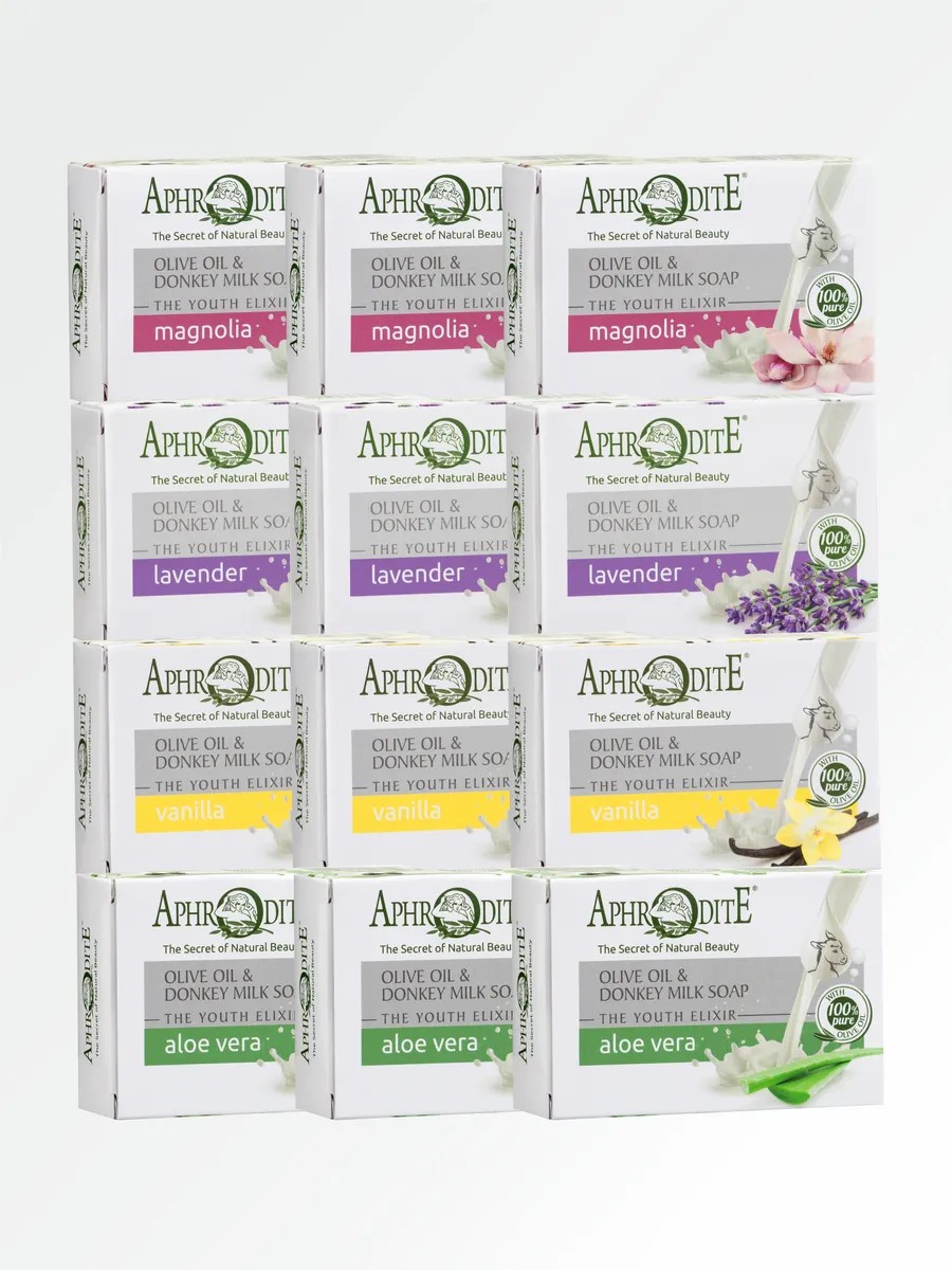 В наборе АФРОДИТА с любовью собраны самые лучшие виды оливкового мыла Aphrodite! Вы покупаете 12 видов мыл! Распробуйте лучшую косметику из Греции и выберите для себя идеальный аромат мыла.
