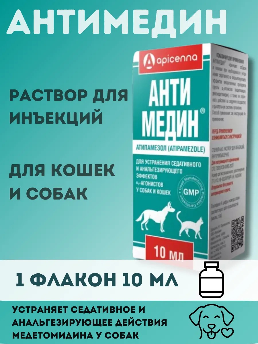 Antimedin is used to eliminate the sedative and analgesic effects of medetomidine in dogs and cats, as well as when it is necessary to eliminate the side effects of medetomidine on the cardiovascular and respiratory systems. Antimedin is used 15-60 minutes after alpha2-agonists.