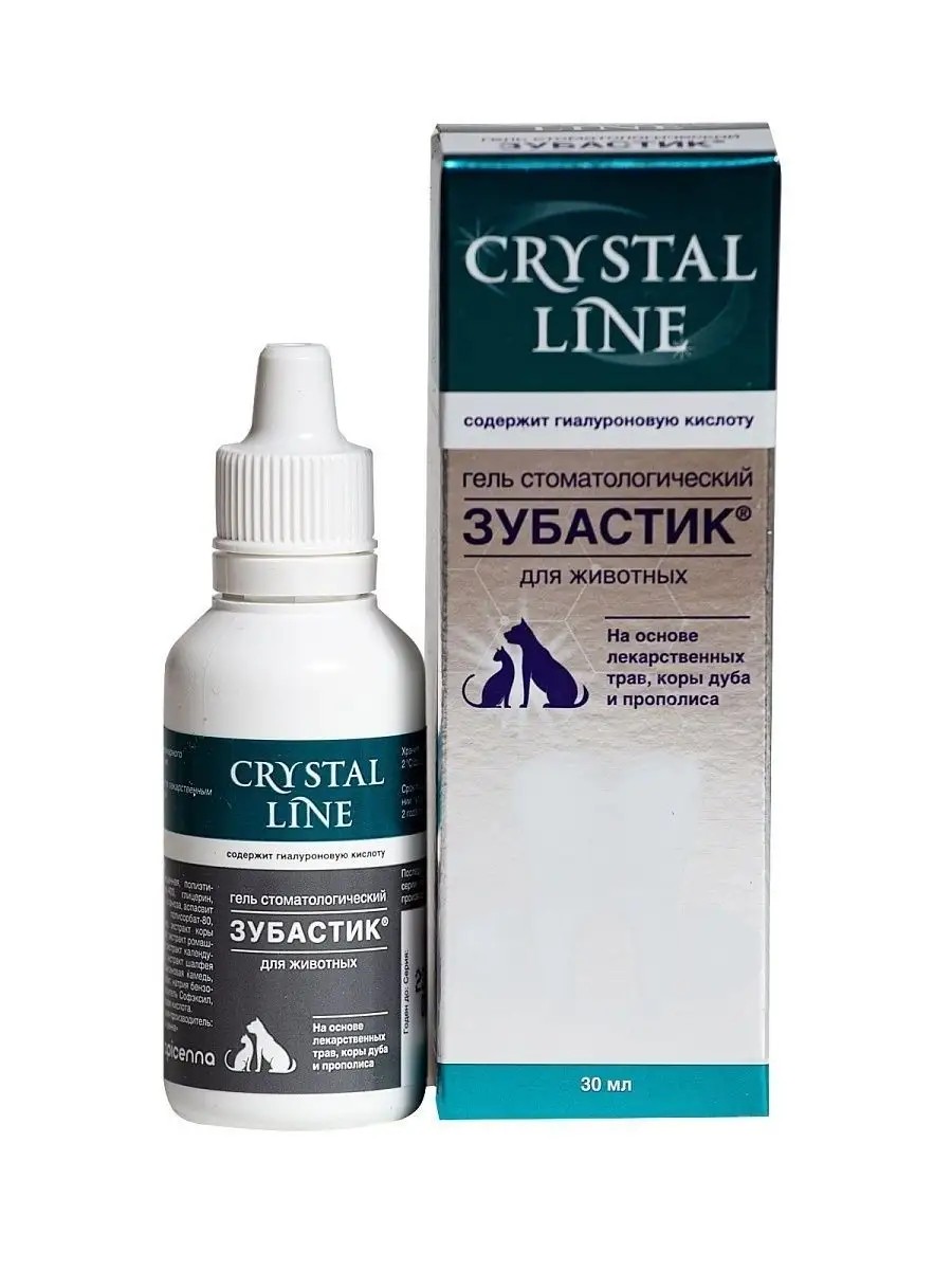 Гель Зубастик Crystal Line стоматологический 30мл Apicenna Зоогигиенический и стоматологический гель. Гиалуроновая кислота в средствах для зубов и полости рта улучшает микроциркуляцию в дёснах, снимает воспаление и кровоточивость дёсен, снижает болевые ощущения, придаёт свежесть дыханию, усиливает регенерацию дёсен, стабилизирует межклеточное пространство, предохраняя ткани пародонта от проникновения новых вирусов, бактерий. Профилактика образования зубного налёта за счёт ферментов и прополиса. Подходит для ежедневного применения, а также после операций в полости рта. 3-5 капли наносятся на десны и прикорневую часть зубов и слегка втираются, после нанесения геля не рекомендуется в течение 30 минут кормить и/или поить животное