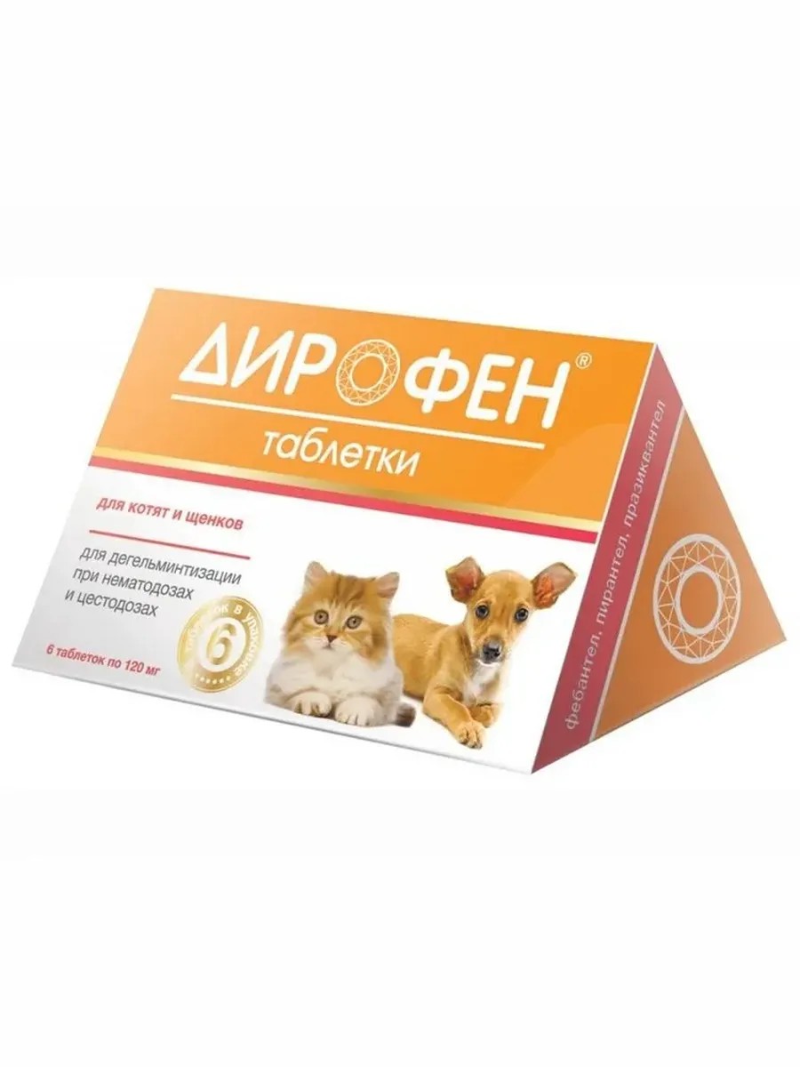 | Полное наименование товара | ДИРОФЕН таблетки от гельминтов для котят и щенков 120мг (6 таблеток) |