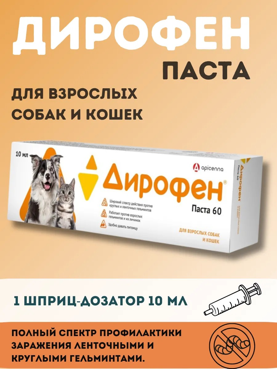 | Полное наименование товара | Дирофен паста 60 для взрослых собак и кошек, 10 мл |