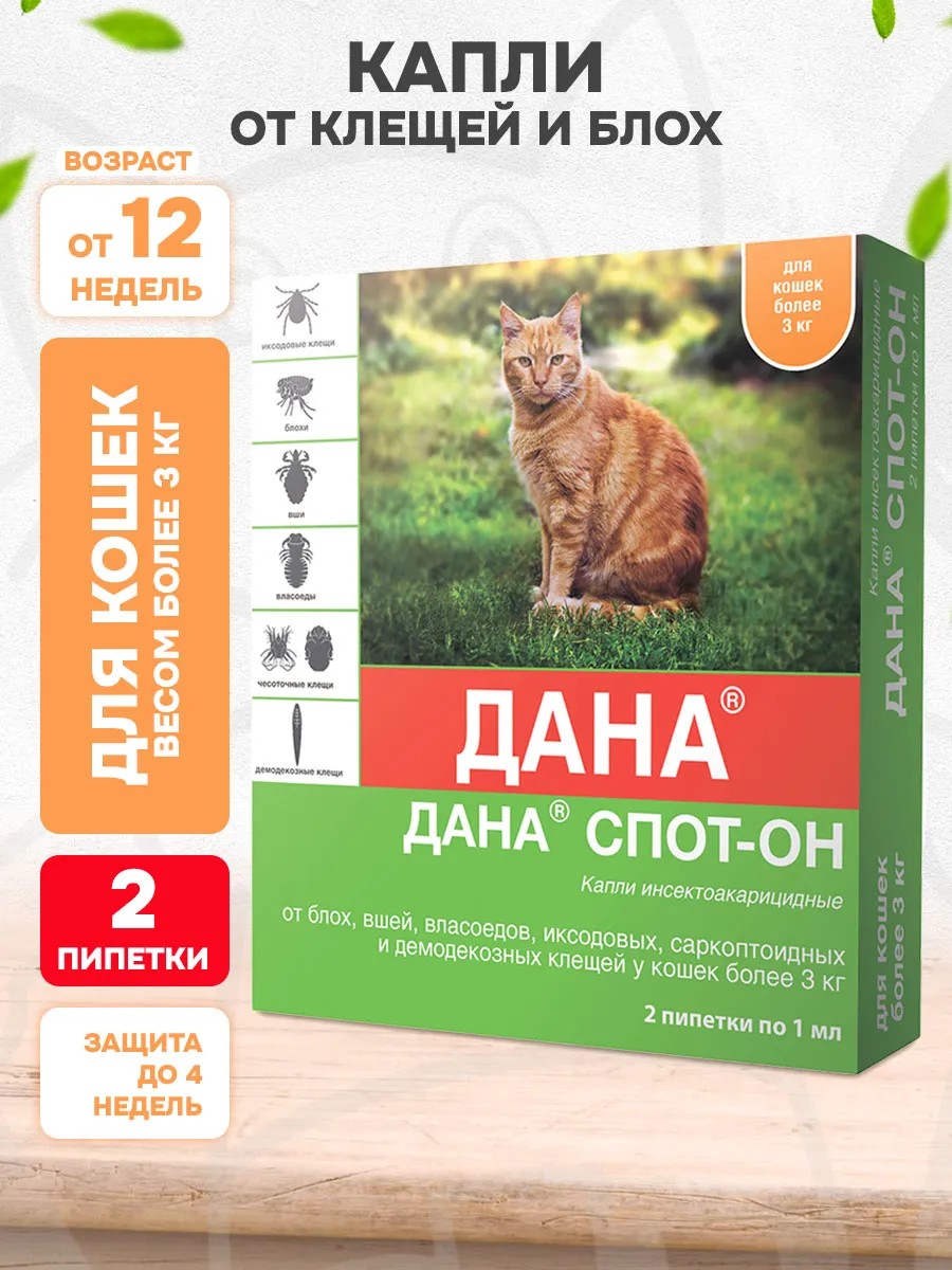 apicenna Дана Спот-он капли от клещей блох для кошек от 3кг 2 пипетки