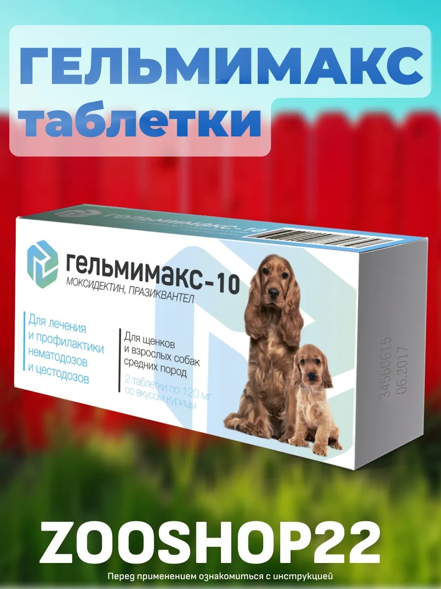 | Полное наименование товара | Гельмимакс-10 таблетки от глистов для щенков и собак средних пород: против круглых и ленточных гельминтов, для дегельминтизации, при гельминтозе, 2 таблетки по 120 мг |