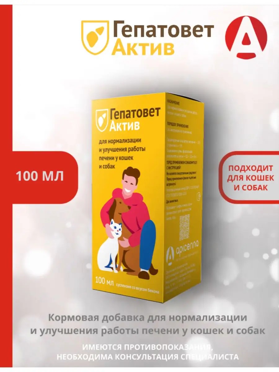 Attention: the product is supplied in new packaging! Apicenna, Apicenna, feed supplement for normalizing and improving liver function Hepatovet Active, 100 ml. This supplement is used to maintain and improve the function of the liver and gallbladder in dogs and cats. It can be used to reduce the possible adverse toxic effects of certain medications. Features and benefits: Accelerated restoration of animal liver cells.