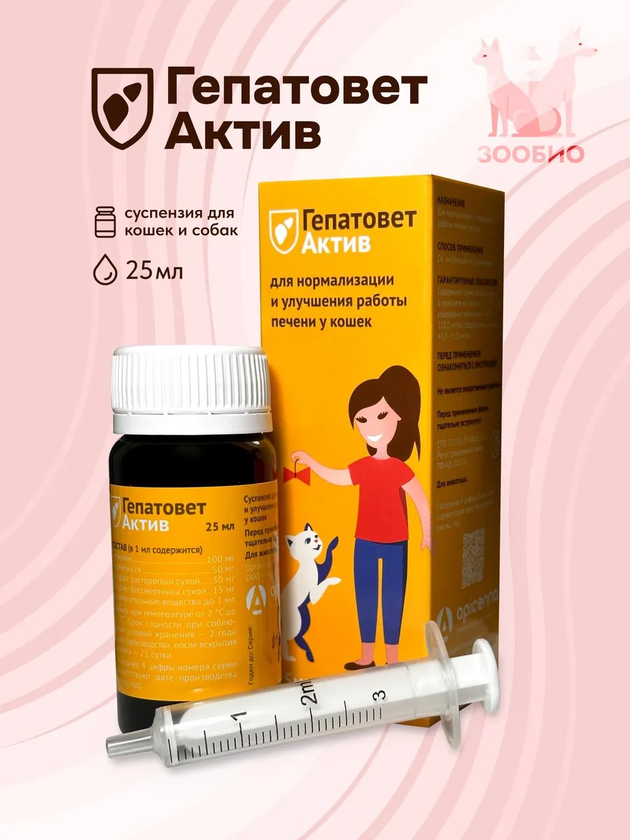 Гепатовет актив 25 мл — Здоровая печень для Вашего Любимца! Для поддержания и восстановления функций печени у собак и кошек. Суспензия содержит натуральные компоненты, которые способствуют улучшению обмена веществ в клетках печени, восстановлению её структуры и функций, а также защите от вредного воздействия токсинов.Препарат выпускается в виде суспензии с приятным вкусом, что облегчает его применение для животных.