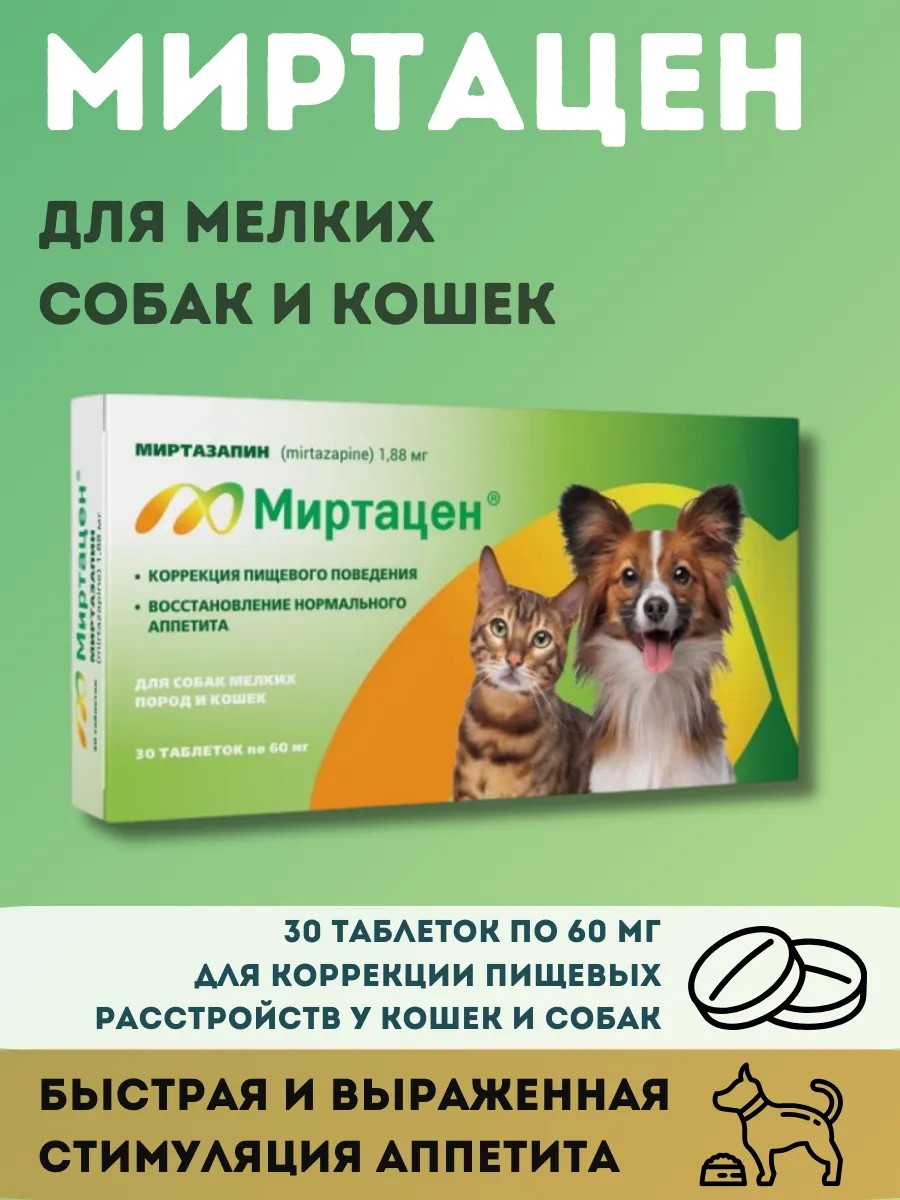 | Полное наименование товара | Миртацен 1,88 мг для собак мелких пород и кошек, таблетки, № 30 |