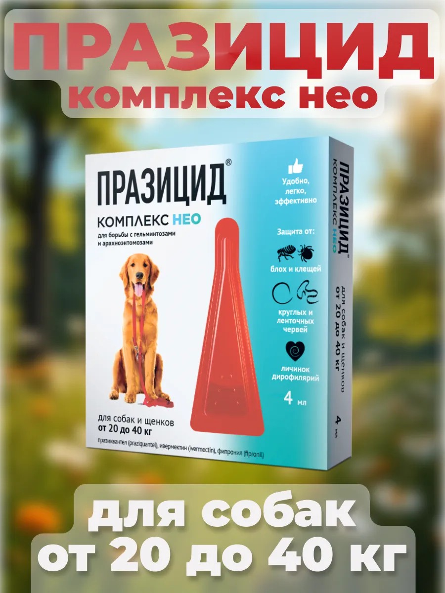 | Полное наименование товара | Празицид Комплекс Нео капли на холку для собак крупных пород 20-40 кг от блох, клещей, гельминтов, глистов, вшей, власоедов, для защиты и лечения, 1 пипетка |
