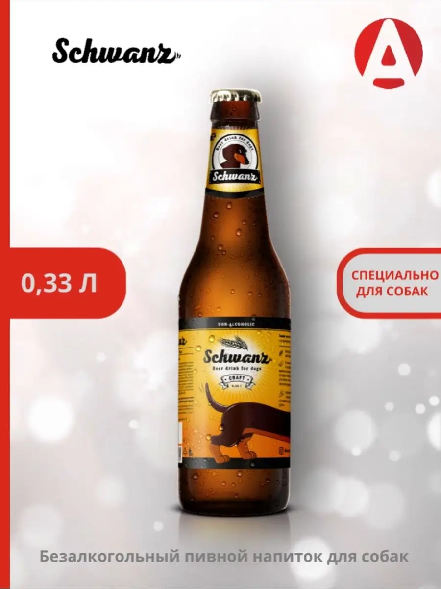Apicenna, Apicenna. Vitamin-enriched treat for non-productive animals (beer drink/beer for dogs) Schwanz (Schwanz), 330 ml. This treat provides an additional source of fluid, giving your pet a taste pleasure. Developed by veterinarians, this treat is suitable for dogs of all breeds. Features and benefits: - Schwanz is the perfect way to pamper, share a traditional evening meal, or celebrate a holiday with your furry friend. - A healthy treat in the form of a broth based on liver and vitamins. - Stimulates a surge of energy and a great mood. - Thanks to barley malt and the taste of liver, this beer drink will become a favorite treat for your pet. - Vitamins, minerals, and essential amino acids in brewer's yeast have a beneficial effect on digestion and metabolism, have an immunostimulating effect, help eliminate toxins, and add shine to the coat. Does not contain alcohol! Directions: Use this treat as an additional source of fluid to provide animals with a pleasant taste, in a dose of no more than 100 ml per kilogram of body weight per day. After opening, store at a temperature of 0 to 6 degrees Celsius for no more than 3 days. Ingredients: First-category artesian water, barley malt, brewer's yeast (vitamins B, E, amino acids, minerals), feed additive EXL 099 (contains at least 83% liver), preservatives. Alcohol-free, non-carbonated. Non-GMO. #dogbeer#vitamindrink#treat