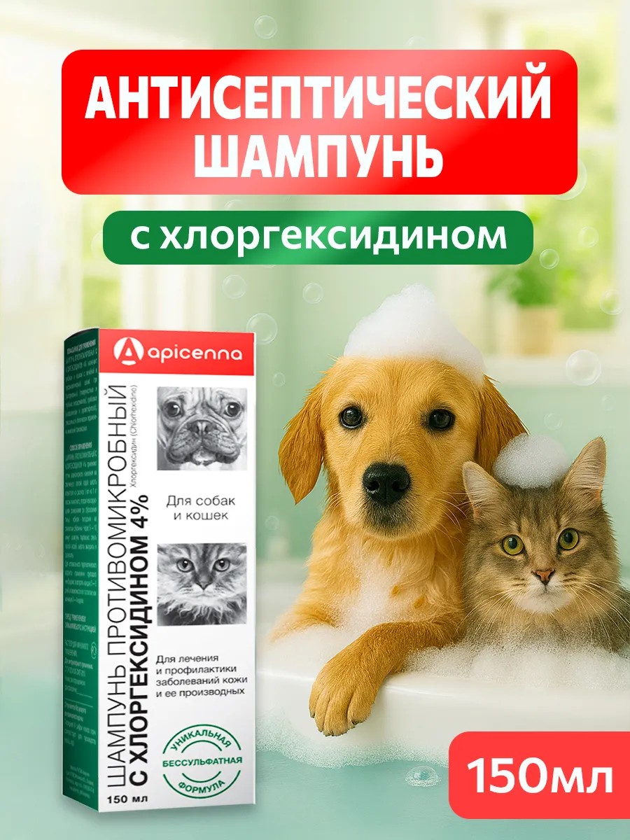 apicenna Шампунь для кошек и собак с хлоргексидином 4% | противогрибковый, противозудный, гипоаллергенный уход
