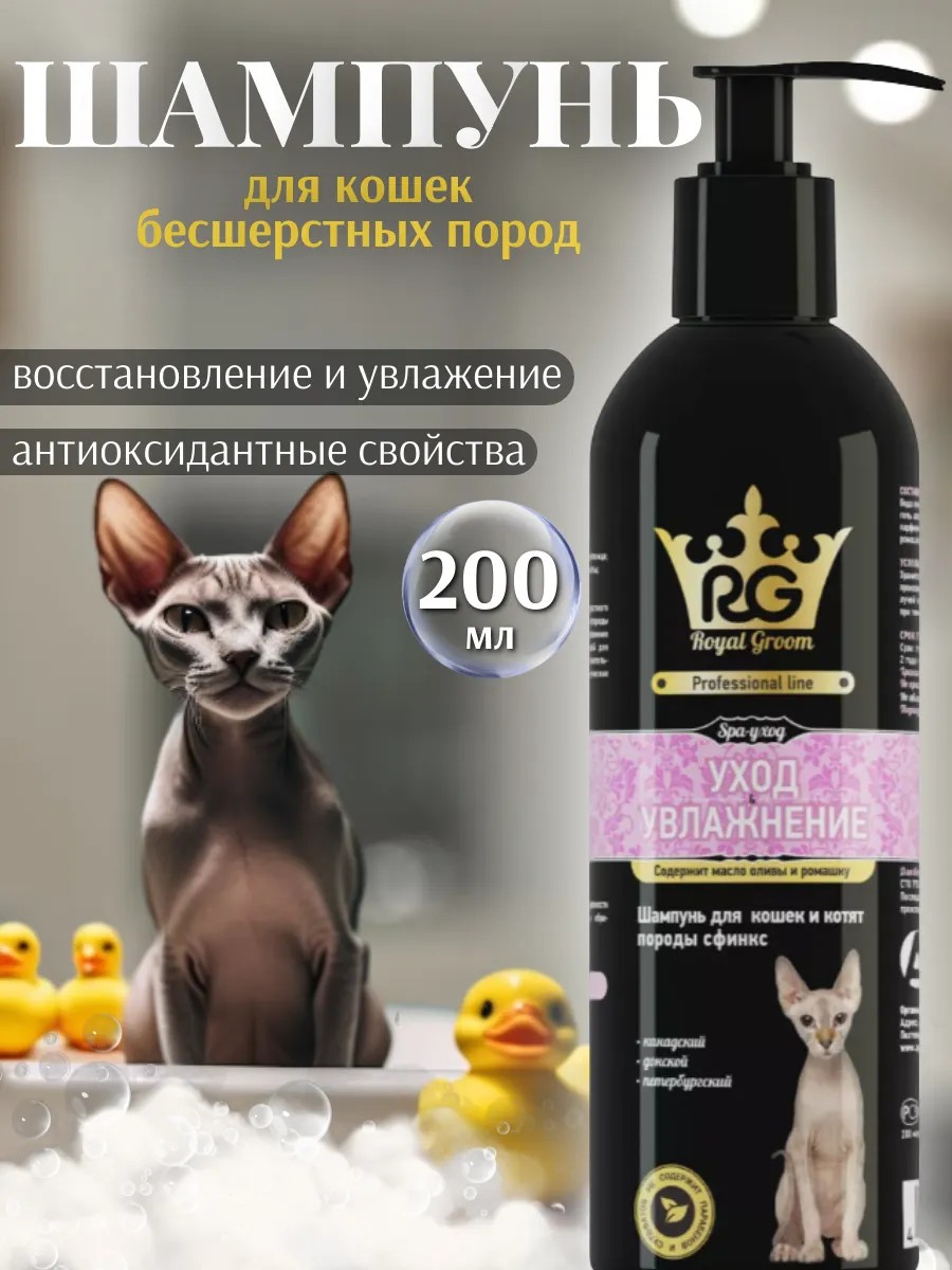 Шампунь обладает выраженными моющими свойствами, образует обильную пену в воде любой жесткости, легко смывается, придает шерсти шелковистость и блеск, снимает статический эффект. Растительные экстракты содержат комплекс биологически активных веществ, которые улучшают состояние кожи и шерсти, смягчают, увлажняют кожу, ускоряют ее регенерацию, восстанавливая эпидермальный барьер, обладают антиоксидантными свойствами. Шампунь Роял Грум для кошки и кота породы сфинкс.