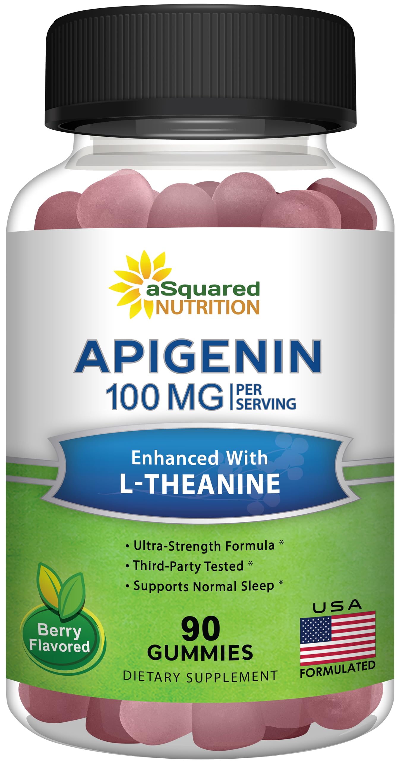 Third-Party Tested GMP Certified: Formulated in the USA in a GMP-certified facility and third-party tested for purity and potency. Our commitment to quality ensures you receive a product that meets the highest standards for safety and effectiveness. . Clean Ingredients with Natural Flavors Colors: Our gummies contain no artificial dyes, synthetic additives, or unnecessary fillers. They are plant-based, non-GMO, gluten-free, and naturally flavored, making them a clean and effective choice for daily supplementation. . Ultra-Pure 98 Standardized Apigenin: Our premium Apigenin is standardized to 98 , ensuring exceptional potency and effectiveness. Apigenin is a natural flavonoid found in chamomile, parsley, and celery, known for its antioxidant properties, immune support, and benefits for skin and brain health. . Synergistic Formula for Relaxation and Sleep: Apigenin and L-Theanine work together to promote calmness, restful sleep, and cognitive function. This combination may help support a healthy sleep cycle, reduce occasional stress, and enhance mental clarity. . Maximum Strength Apigenin with L-Theanine Gummies: aSquared Nutrition's enhanced formula provides 100 mg of Apigenin (standardized to 98 ) and 100 mg of L-Theanine per 2-gummy serving. With 90 gummies per bottle, this high-potency formula offers a 45-day supply to support relaxation, sleep, and overall wellness. .