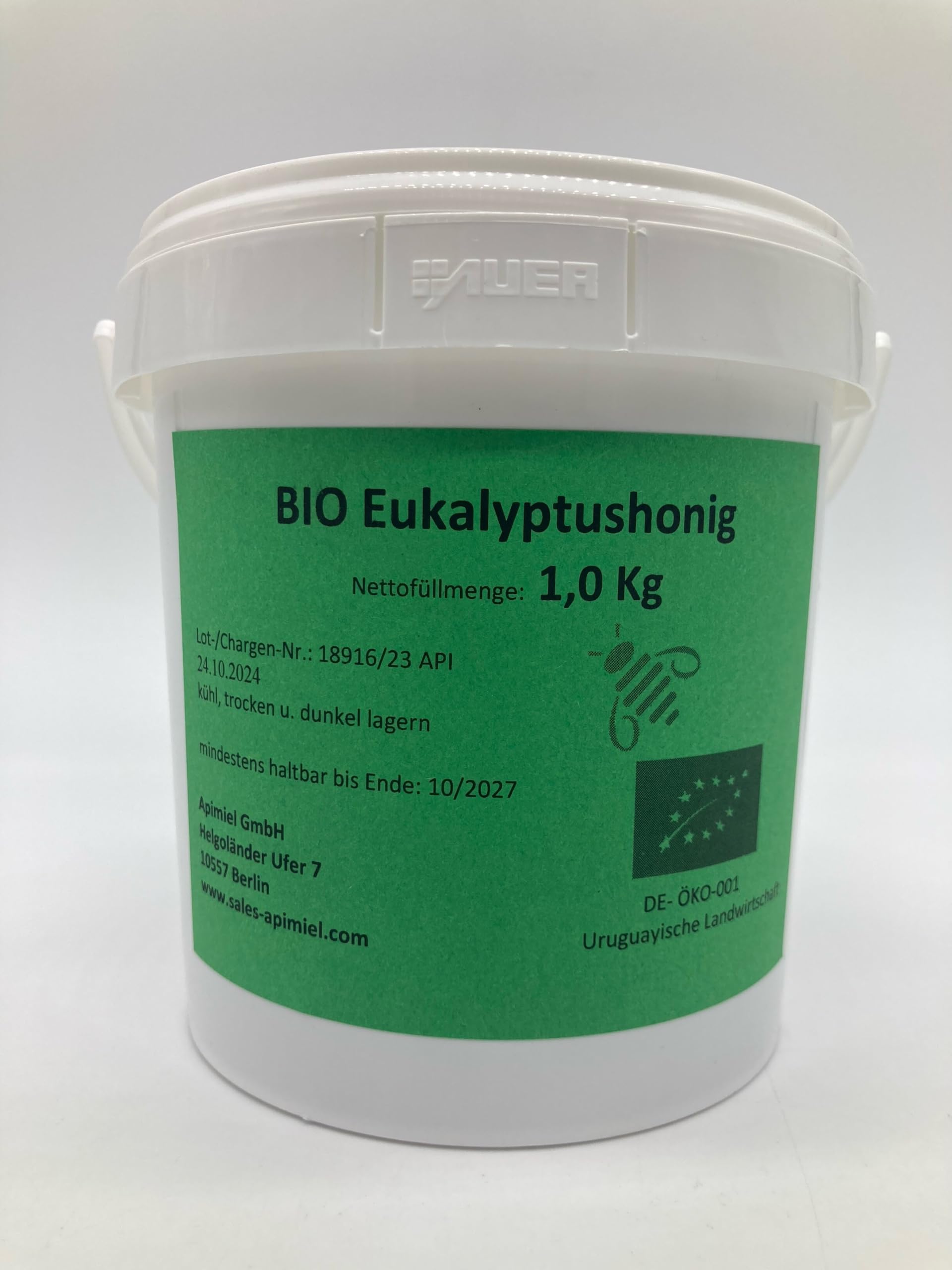 100 natural eucalyptus honey from Uruguay. High quality, strong, spicy, and caramel aroma. Creamy to firm - Can crystallize quickly - In a water bath at maximum Dissolves quickly at 35 C. This is raw honey that has not been filtered or blended. 100 natural. Versatile use. Capacity: 1.0 kg (DE-ÖKO-001)nanLiquid. Raw Uruguayan eucalyptus honey. Miel d'eucalyptus 100 naturel d'Uruguay. De haute qualité, arôme puissant, épicé et caramel. Crémeux à ferme - Peut cristalliser rapidement - Au bain-marie à maximum Dissolution rapide à 35 C. Il s'agit de miel brut qui n'a pas été filtré ou mélangé. 100 naturel. Utilisation polyvalente. Capacité : 1,0 kg (DE-ÖKO-001)nanLiquide. Miel d'eucalyptus Uruguay brut.