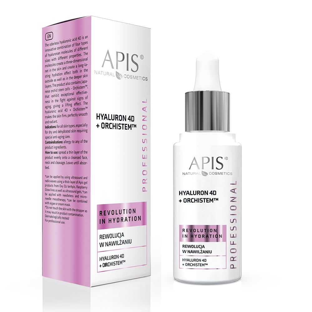 APIS Hyaluron 4D Orchist Hyaluronic Acid Facial Serum Properties of APIS Facial Serum: HYALURON 4D is a very fast-acting and active concentrate. The hyaluronic acid it contains has four different molecule sizes, allowing it to act at various levels within the skin. The skin remains intensely hydrated. Regular use guarantees improved hydration. The formula also contains stem cells from the Japanese orchid Orchist, which demonstrate exceptional effectiveness in combating the signs of aging, providing a lifting effect. The result is firm, perfectly smooth, and radiant skin. How to use APIS serum: Apply a few drops of Hyaluron 4D Orchist with a dropper to cleansed skin. Spread it over the entire face, neck, and décolleté. Wait for the concentrate to be absorbed. Do not wash. Apply your favorite cream now. Use 1-2 times daily. You can introduce the product via ultrasound, needle-free mesotherapy, or microneedling. You can also apply any algae mask on top. To enhance the effect, use an intensive hydrating mask in the earlobe. Remember not to touch the skin with the dropper! Ingredients: Aqua, Sodium Hyaluronate Acetylate, Sodium Hyaluronate Crosspolymer, Hydrolyzed Sodium Hyaluronate, Glycerin, Calanthe Discolora Extract, Xanthan Gum Acetyl, Phenoxyethanol, Caprylyl Glycol. Dermatologically tested. INGREDIENTS Hyaluronic Acid, Japanese Orchid SAFETY WARNING On the packaging See morePremium quality ingredients.APIS HYALURON 4D ORCHISTEM TM 30 MLDESCRIPTION DU PRODUIT DESCRIPTION DU PRODUIT APIS Hyaluron 4D Orchist Sérum pour le visage à l'acide hyaluronique Propriétés du sérum pour le visage APIS : HYALURON 4D est un concentré très rapide et actif. L'acide hyaluronique qu'il contient a quatre tailles de molécules différentes, grâce auxquelles il agit à différents niveaux de la peau. La peau reste intensément hydratée. Lorsqu'il est utilisé systématiquement garantit une amélioration de l'hydratation. La préparation contient également des cellules souches de l'orchidée japonaise Orchist, qui montrent une efficacité exceptionnelle dans la lutte contre les signes du vieillissement, donnant un effet lifting. Le résultat de l'action est une peau ferme, parfaitement lisse et radieuse. Comment utiliser le sérum APIS ? Appliquez quelques gouttes d'Hyaluron 4D Orchist avec un compte-gouttes sur une peau nettoyée. Étalez-le sur tout le visage, le cou et le décolleté. Attendez que le concentré soit absorbé. Ne pas laver. Appliquez votre crème préférée maintenant. Utilisez 1-2 fois par jour. Vous pouvez introduire le produit par ultrasons, mésothérapie sans aiguille ou micro-aiguilles. Vous pouvez également appliquer n'importe quel masque d'algues dessus. Pour rendre l'effet encore meilleur, utilisez un masque hydratant intensif dans le lobe Hyaluron 4D N'oubliez pas de ne pas toucher la peau avec une pipette! Ingrédients : Aqua, Hyaluronate acétylate de sodium, Hyaluronate de sodium, Hyaluronate de sodium Crosspolymer, Hyaluronate de sodium hydrolysé, glycérine, extrait de calanthe discolore, acétyle de gomme de Xanthan, Phenoxyethanol, Caprtylyl Glycol. Testé dermatologiquement. INGRÉDIENTS Acide hyaluronique, orchidée japonaise AVERTISSEMENT DE SÉCURITÉ Sur l'emballage Voir plusIngrédients de qualité supérieure.