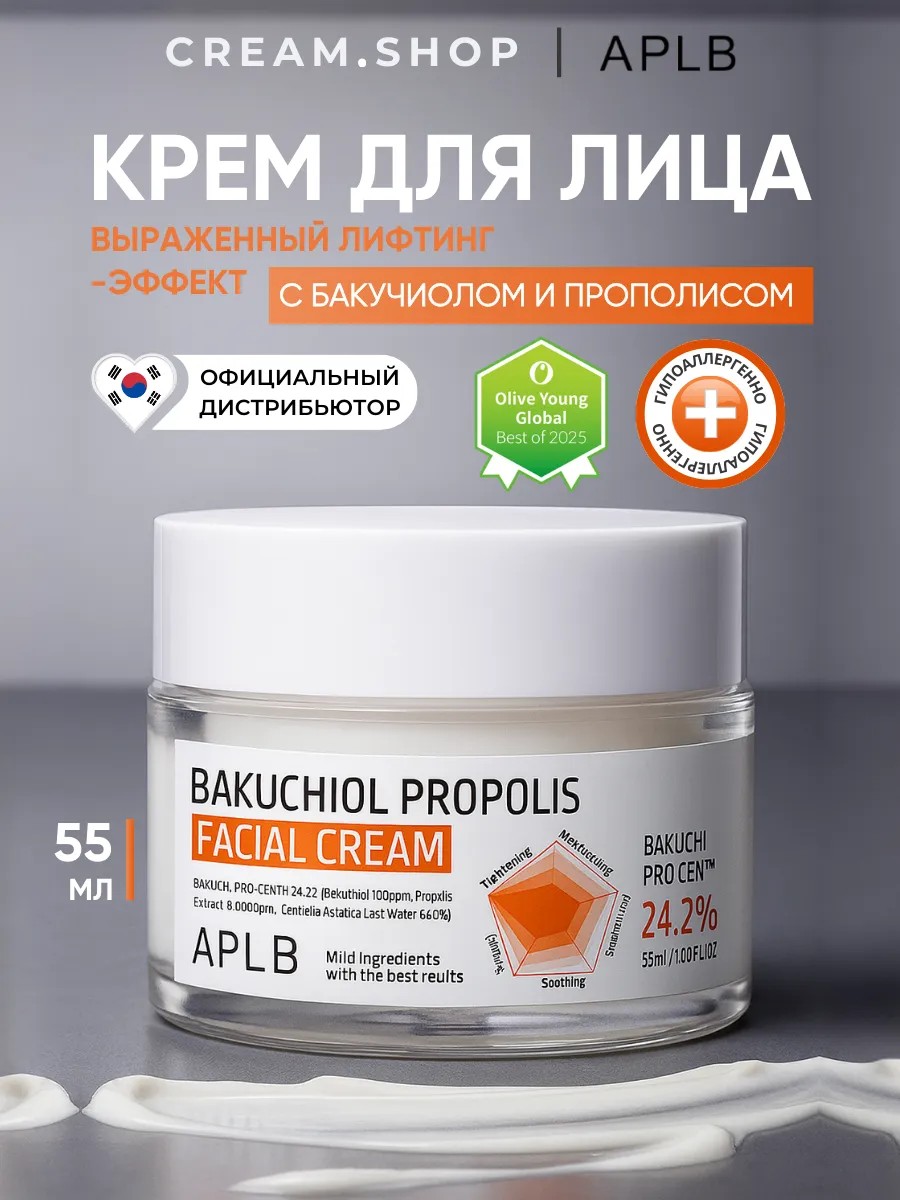 Представляем вам увлажняющий крем для лица Bakuchiol Propolis Facial Cream от APLB – легендарным корейским брендом, которая создает успокаивающую антивозрастную косметику высочайшего качества!Омолаживающий крем для лица содержит мощный ингредиент бакучиол, который борется с морщинами, жирным блеском и пигментными пятнами. Средство обеспечивает ровный тон кожи, снижает глубину морщин, ускоряет восстановление кожного барьера. Содержит такие успокаивающие компоненты как прополис, центелла и гиалуроновой кислота, за счёт чего продукт обеспечивает вашей коже интенсивное увлажнение и питание, повышает упругость и эластичность, придаёт мягкость и гладкость коже. Этот продукт отличается своим мощным антивозрастным действием и отлично подойдёт для ухода за кожей 45+. Крем для лица из Кореи обеспечивает лифтинг-эффект, подтягивает овал лица. Подходит для возрастной кожи, как жирного, так и сухого типа. Наслаждайтесь молодостью и сиянием кожи каждый день. Если вы ищете подарок для подруги или мамы на день рождения, то этот крем - отличное решение на любой праздник. Достигайте видимых результатов с корейской косметикой APLB.