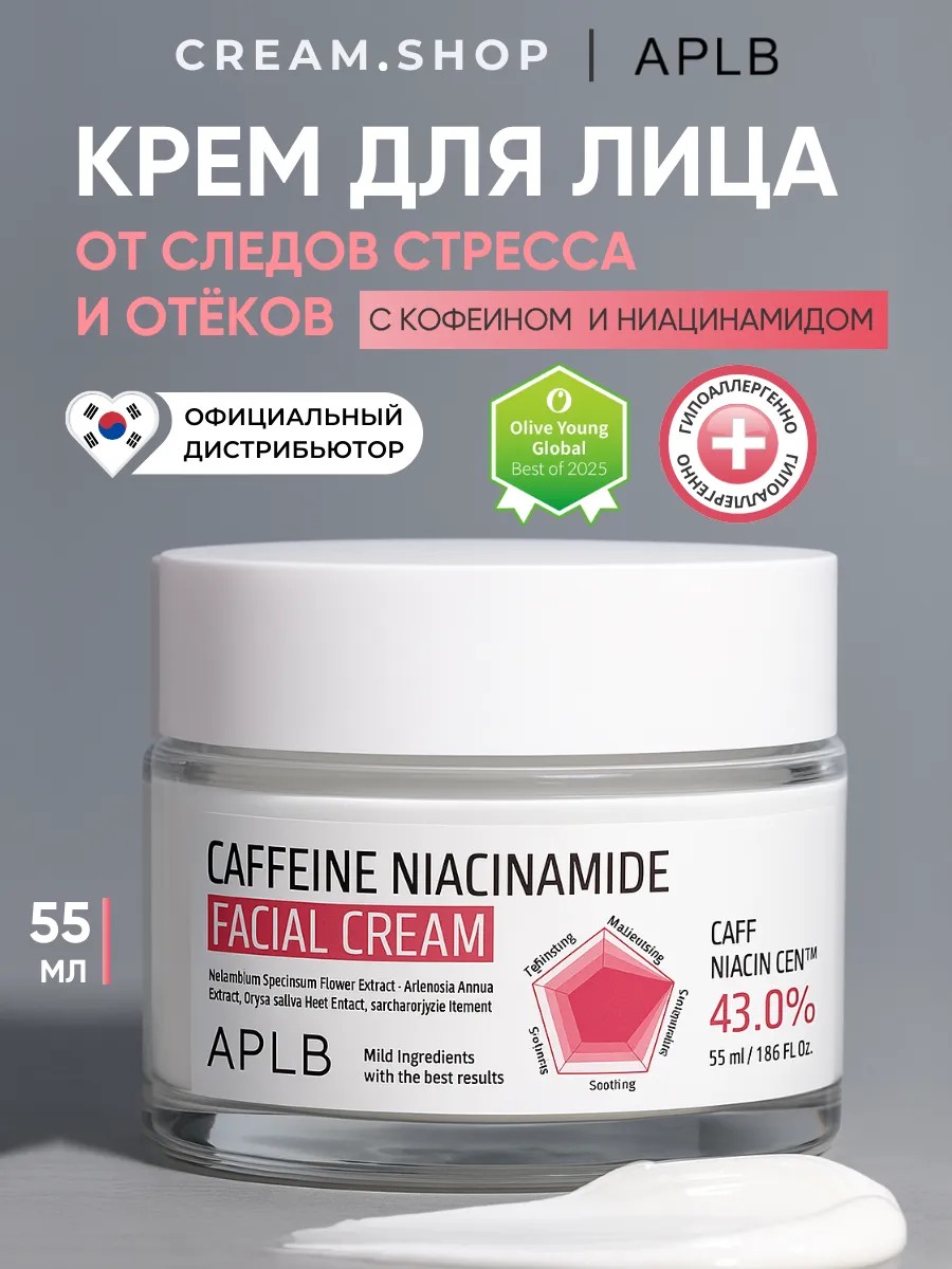 Увлажняющий крем для лица Caffeine Niacinamide Facial Cream от APLB поможет быстро привести лицо в порядок после сна. Корейский крем для лица оказывает лимфодренажный эффект, уменьшает отёки и тёмные круги под глазами, обеспечивает лифтинг-эффект, контур лица становится более ясным и выразительным. Благодаря содержанию кофеина и ниацинамида придаёт коже здоровое сияние и выравнивает тон, эффективно борется с синяками под глазами и мешками, омолаживая и освежая ваш облик. Антивозрастной крем также эффективно боретсся с несовершенствами кожи. Он способствует сужению пор, избавляет от черных точек и следов постакне. Гидролат центеллы в составе успокаивает кожу, снимает красноту и зуд, борется с прыщами и акне, осветляет следы постакне. Продукт подходит для сухой и комбинированной кожи, в том числе чувствительной, для дневного и ночного ухода. Можно использовать для ухода за кожей вокруг глаз. Может использоваться как база под макияж. Сделайте подарок вашей любимой женщине. Получить такой крем на день рождения или 8 марта будет приятно и подруге, и вашей маме, и коллеге по работе. Попробуйте новинку корейской косметики прямо сейчас и наслаждайтесь красотой и уходом, который заслуживает ваша кожа.