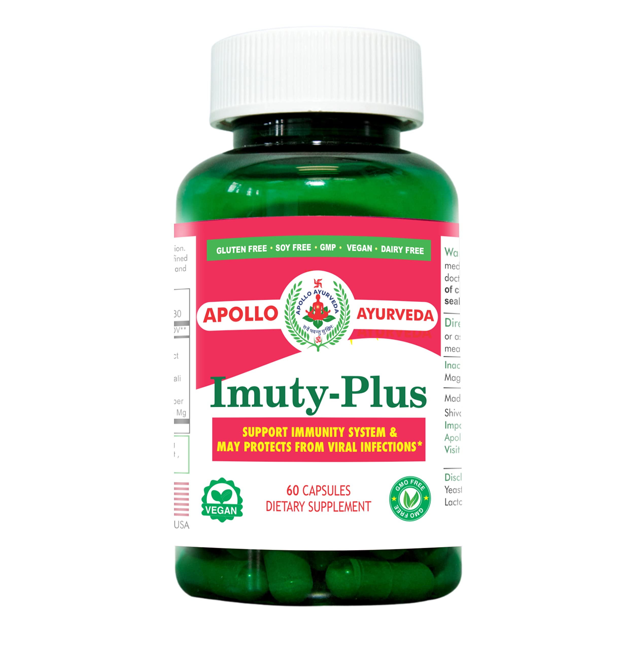 INGREDIENTS LIST : Tinospora cordifolia (Amla), Withania somnifera (Ashwagandha), Ocimum Tenuiflorum (Tulsi), Piper Nigrum (Kali Mirch), Thespesia Grandiflora (Magga), Glycyrrhiza Glabra (Mulethi), Desmodium Gangeticum (Salparni), Zingiber officinale (Sund Dry Ginger). NATURAL INGREDIENTS : Our Products are manufactured in USA. All of our products strength equivalent to 5000 mg contain a 10:1 herb extract ratio from finest plant extracts.All ingredients in Capsules consist of 100 natural ingredients such as Amla extract, Holy Basil, Shama Tulsi, Giloy Extract, Ashwaganha, Mulethi, Kali Mirch, Magga Pepper Longum, Sund Dry Ginger, and Salparni. This product is gluten-free, soy-free, dairy-free, manufactured in GMP certified lab, and is vegan. DAILY ROUTINE CAPSULE : Imuty Plus Capsules are designed to fit seamlessly into your daily routine. Simply take the recommended dosage with water, and let the power of Ayurveda work its magic. CAPSULES : Each Bottle contains 60 Apollo Ayurveda Imuty Plus capsules that naturally support Immune System. IMUTY PLUS SUPPORTS : This supplement helps to support Immunity and helping to protect you against sickness and disease. Its blend of natural ingredients works together to support and enhance your body's defense mechanisms.