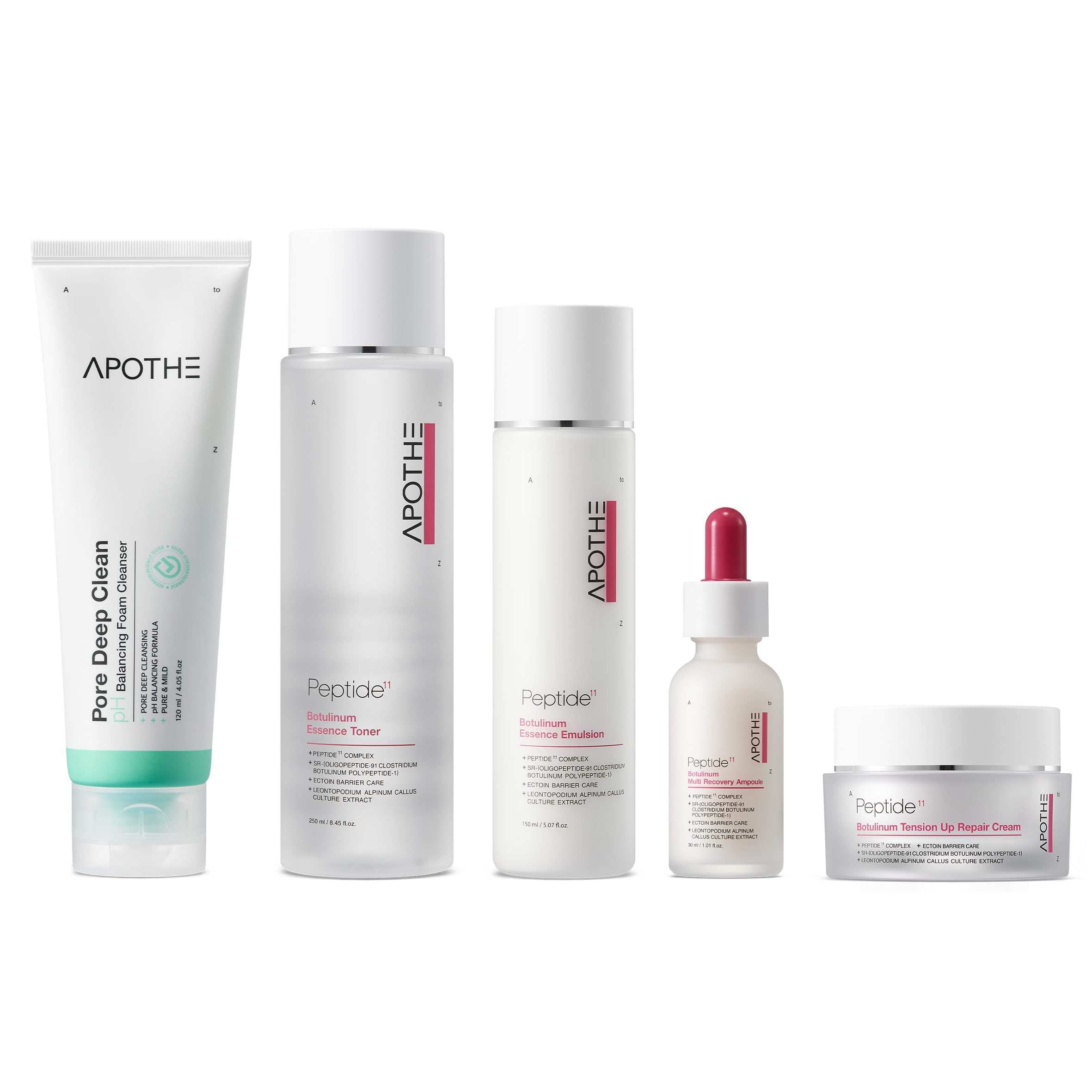 This complete Peptide¹¹ Botulinum skincare set is designed to support firmer, smoother, and more resilient skin through a full daily routine. The set includes a gentle pH-balancing cleanser, a deeply hydrating essence toner, a multi-recovery ampoule, a lightweight peptide emulsion, and a repairing cream to help improve skin elasticity, hydration, and overall skin barrier strength. Powered by advanced Peptide¹¹ technology and skin-supporting ingredients, each step works together to deliver targeted care while remaining suitable for daily use. Ideal for all skin types, especially those concerned with fine lines, loss of firmness, dehydration, or early signs of aging. Perfect as a complete skincare system or a premium self-care set.A New Year Skincare Reset – A complete 5-step routine designed to help refresh and elevate your skincare habits for the new year, supporting firmer, smoother-looking skin through consistent daily care. Gentle Yet Effective for Daily Use – Lightweight, layer-friendly textures suitable for all skin types, including sensitive and mature skin. Targeted Care for Elasticity Radiance – Helps address fine lines, loss of firmness, dehydration, and uneven texture with consistent daily use. Powered by Peptide¹¹ Technology – Formulated with botulinum-inspired peptides and skin-supporting ingredients to help improve elasticity, hydration, and skin barrier strength. Complete Peptide¹¹ Botulinum Skincare Routine – A full multi-step system including cleanser, toner, ampoule, emulsion, and cream to support firmer, smoother, and healthier-looking skin.