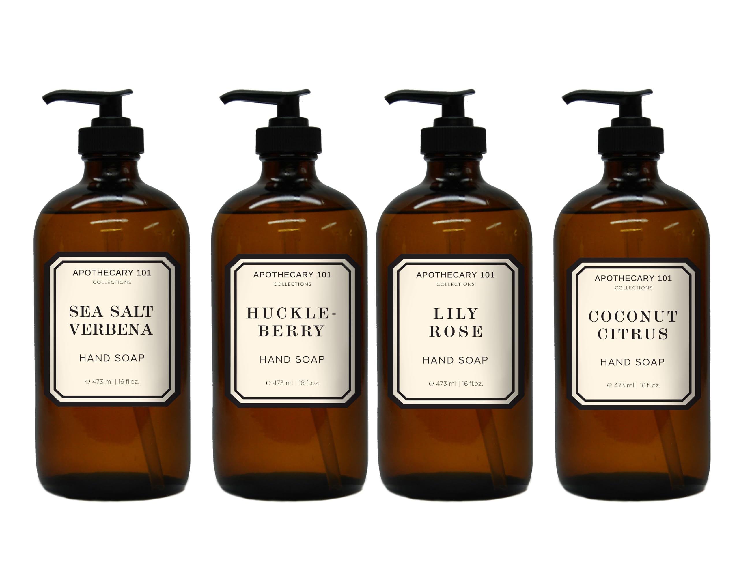 MADE IN USA: Professionally manufactured in the United States. QUALITY PACKAGING: Sturdy amber glass bottles with classic apothecary-style labels and durable pump mechanisms for reliable daily use. VERSATILE USE: Suitable for all skin types and perfect for bathrooms, kitchens, or any space where hand washing is needed. GENEROUS SIZE: Each bottle contains 16 fluid ounces of liquid hand soap with a convenient pump dispenser for easy dispensing. PREMIUM SET: Collection of four luxurious hand soaps featuring Sea Salt Verbena, Huckleberry, Lily Rose, and Coconut Citrus fragrances in elegant amber bottles.