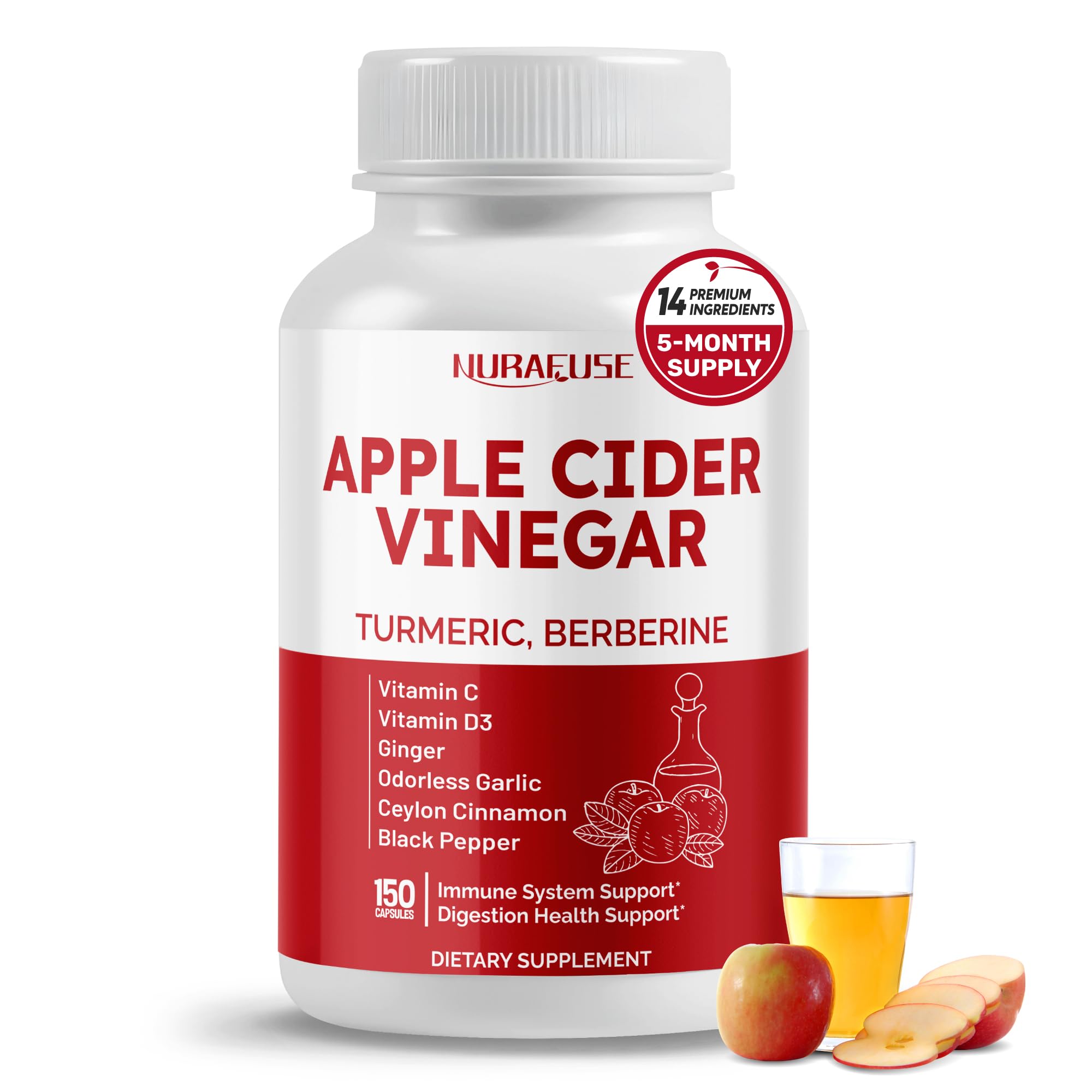 High Standards: Nurafuse ensures trust and purity by rigorously testing every ingredient in ISO 17025-accredited labs. Convenient Capsules: Nurafuse Apple Cider Vinegar capsules are easy to swallow, perfect for on-the-go, fast-absorbing, with no lingering flavor. Outstanding Value: Nurafuse Apple Cider Vinegar delivers a powerful , offering maximum benefits for digestive wellness, immune support, circulation, and overall wellness. 14-in-1 Formula: Nurafuse’s potent formula features 14 carefully chosen ingredients, each shown to enhance your overall wellness in multiple ways. Daily Apple Cider Vinegar Capsules: Each bottle contains 150 capsules, with a potency of per capsule, providing a five-month supply.