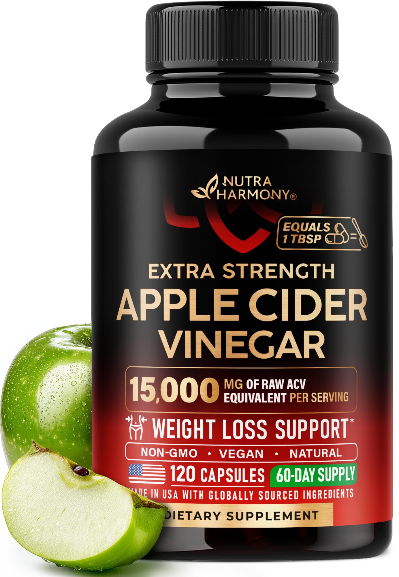 TRUSTWORTHY SERVICE — at NUTRAHARMONY, your well-being is our highest priority. From responsible ingredient sourcing to advanced, precise manufacturing, we are committed to delivering products that you can trust. Our team stands behind every ACV bottle with customer-focused care, ensuring your satisfaction and peace of mind on your wellness journey. PROVEN EFFECTIVENESS MADE IN USA — backed by scientific research and manufactured in a GMP-certified facility in the USA, this supplement meets the strictest standards of purity, safety, and quality. Every batch is carefully tested to ensure consistency and reliability, giving you confidence in what you put into your body. CLEAN NATURAL — made with care using vegan-friendly, sugar-free, and naturally sourced ingredients to fit into any lifestyle. Each capsule is crafted to deliver clean support for balance, wellness, and vitality, without unnecessary additives or fillers. WEIGHT LOSS, ENERGY DIGESTION — supports your healthy weight goals encourage metabolism. Boosts daily energy levels and helps you feel lighter more refreshed. At the same time, it gently supports digestive health, eg occasional bloating or discomfort. EXTRA STRENGTH DAILY DOSE 1 TBSP — Experience the full benefits of one tablespoon of liquid Apple Cider Vinegar packed neatly into just two capsules. Our advanced capsule format is fast, convenient, and gentle on your teeth, throat, and stomach lining — offering the same advantages as liquid ACV but without the strong taste, enamel damage, or lingering aftertaste. APPLE CIDER VINEGAR 15,000 MG — a truly high-potency formula delivering the equivalent of 15,000 mg per serving through a powerful 10:1 concentrate made from 1,500 mg of raw ACV. This concentrated strength gives you all the natural benefits of traditional Apple Cider Vinegar in a convenient form!.