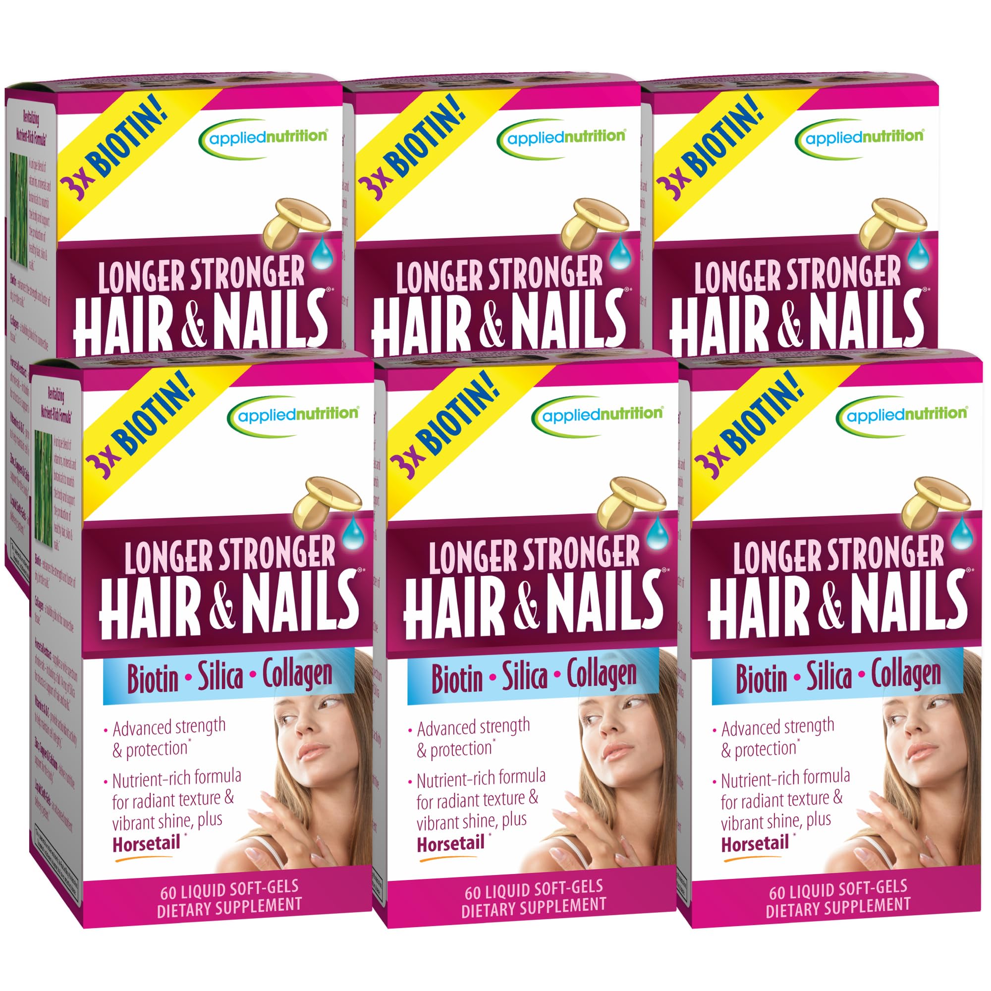 Applied Nutrition Longer Stronger Hair & Nails - 60 Liquid Soft-Gels, Pack of 6 - Biotin, Silica & Collagen - 180 Servings