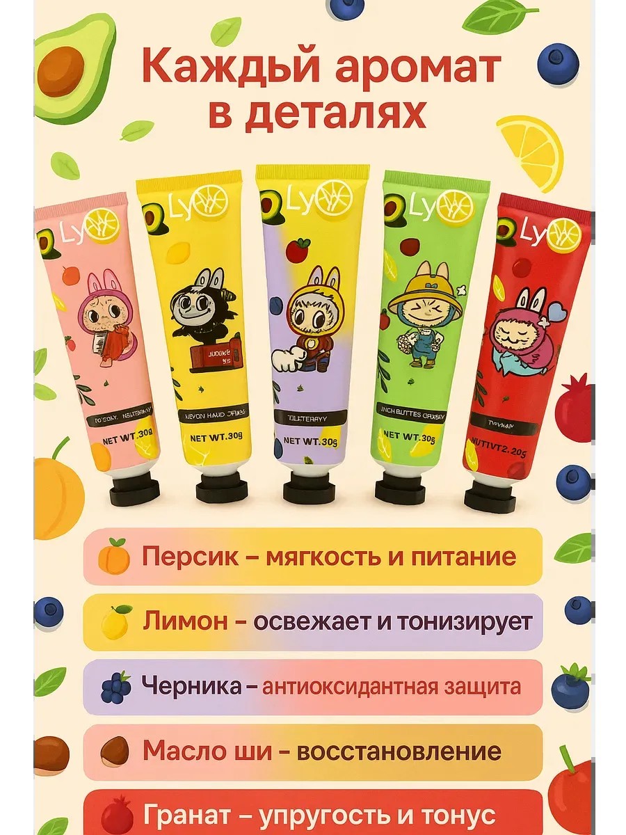 Идеальный подарок для себя или близких! Яркий набор кремов для рук с фруктовыми ароматами: персик, лимон, черника, гранат и масло ши. Каждый тюбик объёмом 30 г легко помещается в сумочку или косметичку — бери с собой куда угодно!