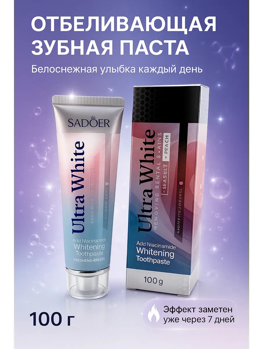 Мечтаете о белоснежной улыбке без похода к стоматологу? Попробуйте зубную пасту — инновационное средство для отбеливания зубов в домашних условиях, созданное на основе природных компонентов. Благодаря ниацинамиду, морской соли и экстракту персика, паста эффективно удаляет налёт от кофе, чая, курения и пищи, не повреждая эмаль.