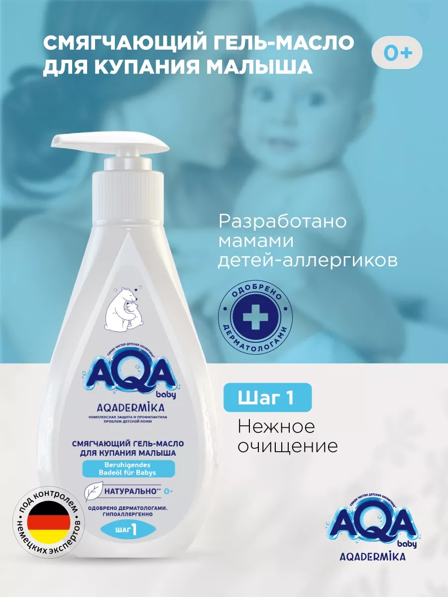 DERMIKA / Softening bathing gel oil for babies, 250 ml. AQA Dermika is a unique step-by-step care system developed to meet the needs of atopic baby skin throughout all stages of skin problems, from the first days of life. Step 1: "gentle cleansing." For bathing a baby during the subacute phase of atopic dermatitis, characterized by flaking and dry skin, as well as seborrheic dermatitis, it is recommended to bathe the baby in water diluted with AQA Dermika bathing gel oil. This softening bathing gel oil, based on hydrolyzed goat milk protein, natural emollients, and skin-related biolipids, provides gentle cleansing, promotes deep hydration, softening, and regeneration of the surface layer of the skin. For best results, use with AQA Dermika Restorative Baby Cream-Emollient. AQA baby, Aqua baby, aqua baby, aqua baby, aqua baby.