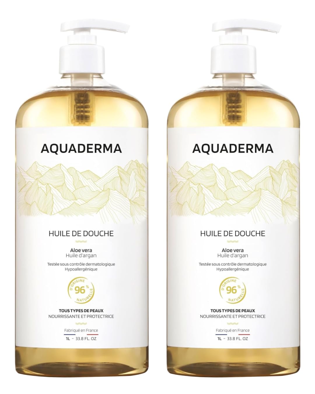 ALL SKIN TYPES: Its gentle, hypoallergenic formula is suitable for all skin types, even the most sensitive, for both face and body. Made in France. NATURAL FORMULA: Formulated with 96 naturally derived ingredients, this shower oil pampers your skin daily and envelops it in a delicate fragrance. MOISTURIZING ALOE VERA: Organic Aloe Vera extract deeply hydrates, soothing the skin during and after showering for lasting comfort. NOURISHING ARGAN: Enriched with Argan Oil, renowned for its nourishing and softening properties, it moisturizes the skin and leaves a delicate protective film after each use. CLEANSING OIL – 2-PACK: This pack contains two 1L bottles of Aquaderma Aloe Vera Argan Oil Cleansing Oil, ideal for daily use in the shower or bath.