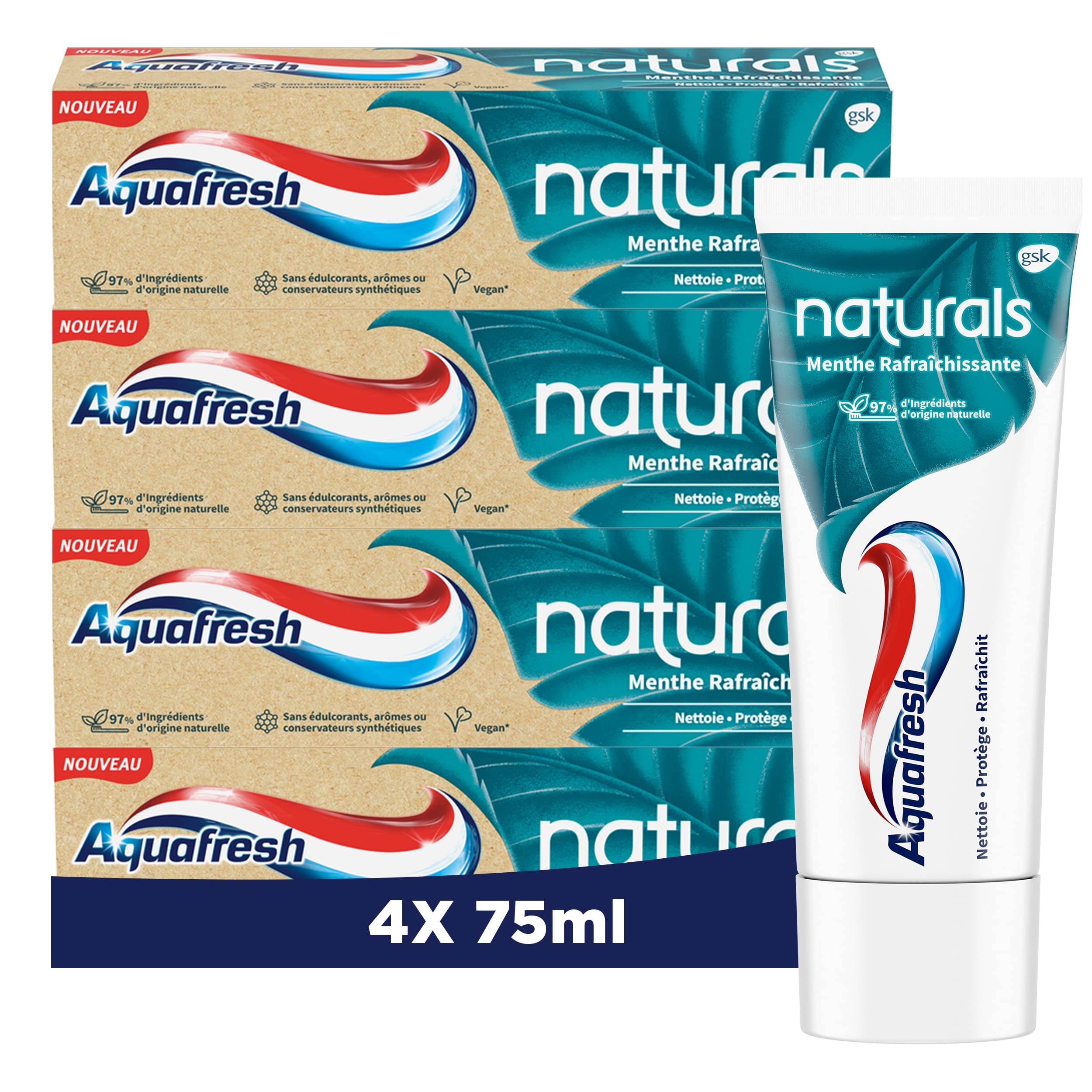 Specifically designed by oral health professionals and combined with our scientific expertise, Aquafresh Naturals contains 97 ingredients of natural origin, to offer you our promise of triple protection for clean teeth, healthy gums and fresh breath. Cleans. Protected. Refreshes. Aquafresh Cooling Mint contains a unique and refreshing blend of 100 natural origin mints, including peppermint and spearmint 100 natural flavors. And our packaging. This box is made from recycled cardboard, and it is recyclable. The tube as well as the cardboard can also be fully recycled.IngredientsAqua, Hydrated Silica, Sorbitol, Glycerin, Sodium Lauryl Sulfate, Aroma, ppm fluoride).Instructions for useALWAYS FOLLOW THESE ADVICE. It is recommended to brush your teeth twice a day, and not to exceed three brushings. Safety Warning Avoid swallowing toothpaste and spit it out after brushing. For children 6 years or younger, use a pea-sized amount of toothpaste under adult supervision to minimize ingestion. If fluoride intake from other sources occurs, consult a dentist or doctor. Keep out of reach of children. If irritation occurs, discontinue use. If you experience swelling of the mouth or face, stop use immediately and consult a dentist. The ends of the cardboard were glued. Do not use if carton ends are open. INGREDIENTS Aqua, Hydrated Silica, Sorbitol, Glycerin, Sodium Lauryl Sulfate, Aroma, DIRECTIONS FOR USE ALWAYS FOLLOW THESE ADVICE. It is recommended to brush your teeth twice a day, and not to brush more than three times. SAFETY WARNING Avoid swallowing toothpaste and spit it out after brushing. For children 6 years or younger, use a pea-sized amount of toothpaste under adult supervision to minimize ingestion. If fluoride intake from other sources occurs, consult a dentist or doctor. Keep out of reach of children. If irritation occurs, discontinue use. If you experience swelling of the mouth or face, stop use immediately and consult a dentist. The ends of the cardboard were glued. Do not use if carton ends are open. Aquafresh Naturals toothpaste comes in fully recyclable packaging and a carton made from recycled cardboard. This fluoride toothpaste contains no artificial sweeteners, flavors, or preservatives. Discover the fresh flavors of a naturally derived blend of mint and botanical herbs. A triple-protection formula that cleans, protects, and refreshes for fresh breath. with twice-daily brushing. Aquafresh Naturals Refreshing Mint is made with 97 naturally derived ingredients and is environmentally friendly . Spécifiquement conçu par des professionnels de la santé bucco dentaire et associés à notre expertise scientifique, Aquafresh Naturals contient 97 d'ingrédients d'origine naturelle, pour vous offrir notre promesse de triple protection pour des dents propres, des gencives saines et une haleine fraîche. Nettoie. Protège. Rafraîchit. Aquafresh Menthe Rafraichissante contient un mélange unique et rafraîchissant de menthes 100 d'origine naturelle, notamment la menthe poivrée et la menthe verte des saveurs 100 naturelles. Et notre emballage. Cette boîte est conçue en carton recyclé, et elle est recyclable. Le tube ainsi que le carton peuvent également être entièrement recyclés.IngrédientsAqua, Hydrated Silica, Sorbitol, Glycerin, Sodium Lauryl Sulfate, Aroma, Xanthan Gum, Carrageenan, Sodium Fluoride, Steviol Glycosides, Limonene, CI 74160, CI 74260. Contient du fluorure de sodium à 0.315 p p (1450 ppm de fluor).Mode d'emploiTOUJOURS SUIVRE CES CONSEILS. Il est recommandé de se brosser les dents 2 fois par jour, et de ne pas dépasser trois brossages.Avertissement De SûretéÉvitez d'avaler le dentifrice et recrachez-le après brossage. Chez les enfants de 6 ans ou moins, utilisez une quantité de dentifrice de la taille d'un petit pois sous la surveillance d'un adulte afin d'en minimiser l'ingestion. En cas d'apport de fluor provenant d'autres sources, consultez un dentiste ou un médecin. Tenir hors de portée des enfants. En cas d'irritation, arrêtez l'utilisation. Si vous ressentez un gonflement de la bouche ou du visage, arrêtez l'utilisation immédiatement et consultez un dentiste. Les extrémités du carton ont été collées. Ne pas utiliser si les extrémités du carton sont ouvertes. INGRÉDIENTS Aqua, Hydrated Silica, Sorbitol, Glycerin, Sodium Lauryl Sulfate, Aroma, Xanthan Gum, Carrageenan, Sodium Fluoride, Steviol Glycosides, Limonene, CI 74160, CI 74260. Contient du fluorure de sodium à 0.315 p p (1450 ppm de fluor). MODE D'EMPLOI TOUJOURS SUIVRE CES CONSEILS. Il est recommandé de se brosser les dents 2 fois par jour, et de ne pas dépasser trois brossages. AVERTISSEMENT DE SÛRETÉ Évitez d'avaler le dentifrice et recrachez-le après brossage. Chez les enfants de 6 ans ou moins, utilisez une quantité de dentifrice de la taille d'un petit pois sous la surveillance d'un adulte afin d'en minimiser l'ingestion. En cas d'apport de fluor provenant d'autres sources, consultez un dentiste ou un médecin. Tenir hors de portée des enfants. En cas d'irritation, arrêtez l'utilisation. Si vous ressentez un gonflement de la bouche ou du visage, arrêtez l'utilisation immédiatement et consultez un dentiste. Les extrémités du carton ont été collées. Ne pas utiliser si les extrémités du carton sont ouvertes. Le dentifrice Aquafresh Naturals est présenté dans un emballage entièrement recyclable et un carton fabriqué à partir de carton recyclé. Ce dentifrice fluoré ne contient aucun édulcorant, arôme ou conservateur de synthèse. Découvrez les saveurs fraîches d'un mélange de menthe et d'herbes botaniques d'origine naturelle. Une formule triple protection qui nettoie, protège et rafraîchit pour une haleine fraîche. avec un brossage deux fois par jour. Aquafresh Naturals Menthe Rafraichissante est composé à 97 d'ingrédients d'origine naturelle et est respectueux de l'environnement .