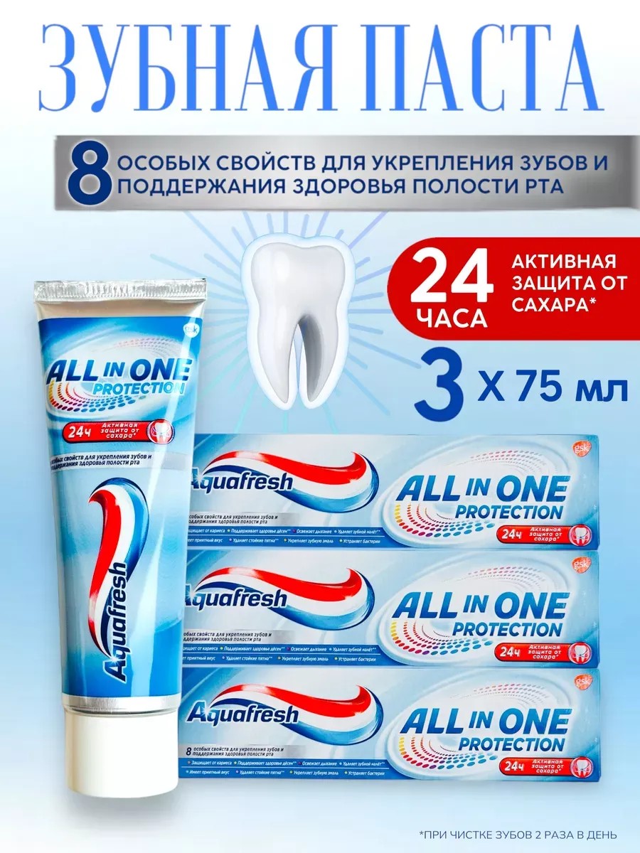 Зубная паста Aquafresh All in one protection обеспечит Вам активную защиту зубов от проникновения сахарных кислот в течение 24 часов при регулярной чистке зубов 2 раза в день.