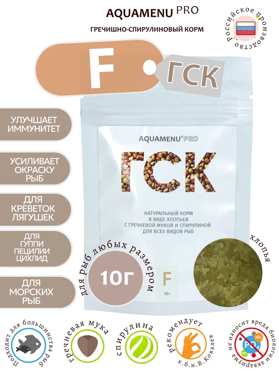 ГСК (Гречишно-спирулиновый корм) сочетает в себе уникальные диетические и стимулирующие свойства гречки и спирулины, легко усваивается и создаёт минимальную нагрузку на экосистему аквариума.