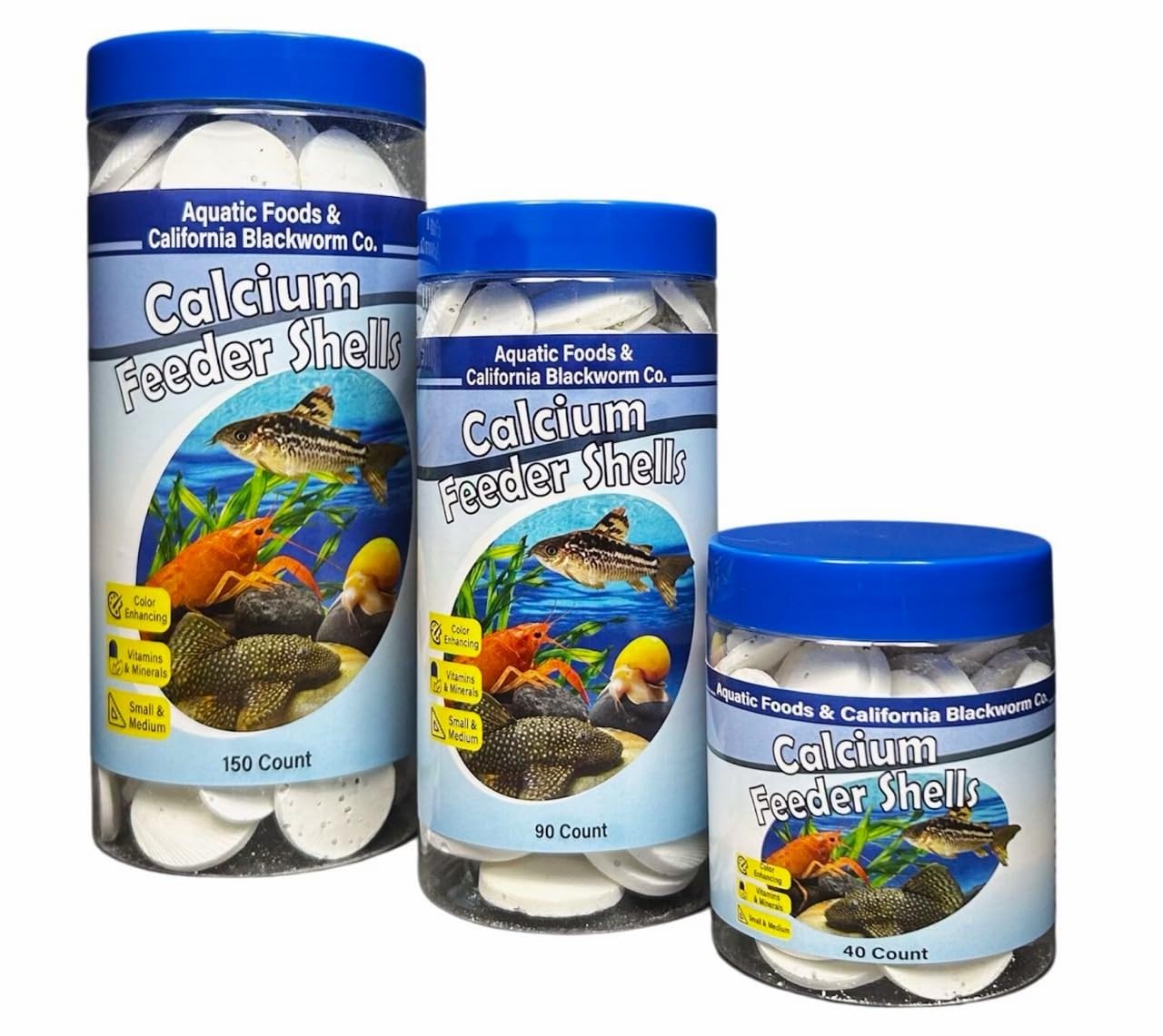Aquatic Foods Blackworm Co. Small Medium Calcium Feeder Shells for Shrimp, Snails, Crayfish, Crabs and Tropicals Our Calcium Feeders are sifted and graded to remove most dust and chips DESCRIPTION Calcium Feeders are perfect for keeping your Shrimp, Snails, Crabs, Crayfish healthy while providing their needed Calcium. Choose from a variety of sizes. Each Feeder contains Calcium, Krill and Spirulina. Specially formulated with color enhancers to bring out the vibrant colors in your Crustaceans. Fortified with essential vitamins and minerals for overall health and longevity. Will not cloud water. Available in a variety of sizes and styles. Ingredients: Calcium sulfate, Fish Meal, Wheat starch, Wheat gluten, magnesium sulfate, Brewer's dried yeast, krill, Spirulina, l-ascorbyl-2-polyphosphate (source of vitamin c), vitamin a acetate, choline chloride, a-tocopheryl acetate (source of vitamin e), niacin, d-calcium pantothenate, riboflavin, thiamin, biotin, pyridoxine hydrochloride, folic acid, d-activated animal sterol (source of vitamin d3), vitamin b12 supplement, zinc proteinate, manganese proteinate, iron proteinate, ethoxyquin (preservative). Guaranteed Analysis: Crude Protein (min) 22.0 Crude Fat (min) 0.01 Crude Fiber (max) 0.01 Moisture (max) 11.0We are Aquatic Foods Blackworm Co. A third generation Aquarium Hobbyist and Family Owned Business selling and shipping quality Tropical Fish Foods to Fellow Fish Keepers. Tropical Fish Foods for Cichlids, Discus, Angel Fish, Bettas, Koi, Tetras, Goldfish, Parrot Fish, Marine Fish, Axolotls, Snails, Shrimp, Pelcos, Flower Horns, Gourami, Loaches, Catfish. Please note: All product photos are not exact, product color and sizes may vary a little. We at Aquatic Foods sift all of our Freeze Dried Foods, Spirulina Algae Wafers, Floating Pellets, Sinking Pellets to remove most Dust, Pieces and Particles prior to shipping to ensure you receive the highest quality Tropical Fish Food. Check out our Reviews and Visit Our Aquatic Foods Blackworm Co. Storefront Where We Have More than 400 Tropical Fish Foods to Choose From.