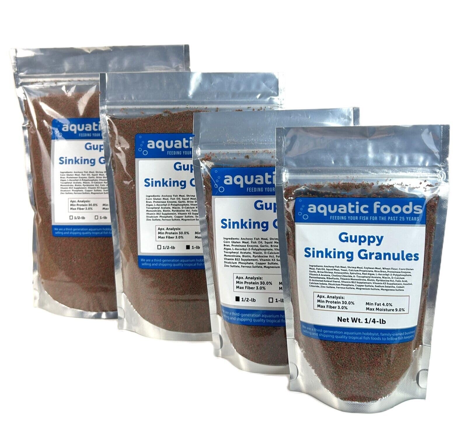 Aquatic Foods Blackworm Co. Guppy Sinking Granules Ingredients: Anchovy Fish Meal, Shrimp Meal, Soybean Meal, Wheat Flour, Corn Gluten Meal, Fish Oil, Squid Meal, Yeast, Calcium Propionate, Rice Bran, Proteinase Enzyme, Garlic, Brine Shrimp, Astaxanthin, Spirulina, Red Algae, L, Ascorbyl, 2, Polyphosphate, Vitamin A Acetate, Choline Chloride, A , Tocopheryl Acetate, Niacin, D, Calcium Pantothenate, Riboflavin, Thiamin Mononitrate, Biotin, Pyridoxine Hcl, Folic Acid, D, Activated Animal Sterol, Vitamin B12 Supplement, Vitamin K3 Supplement, Inositol, Calcium Iodate, Dicalcium Phosphate, Copper Sulfate, Sodium Selenite, Cobalt Chloride, Zinc Sulfate, Ferrous Sulfate, Magnesium Sulfate, Manganese Sulfate Apx. Analysis: Min. Protein 30.0 Min. Fat 4.0 Max Fiber 3.5 Max Moisture 5.5Item Weight: 0.25 pounds Storage Instructions: Store In Room Temperature Age Range Description: All Age Size of Guppies, Tetras, Small Tropicals. We are Aquatic Foods Blackworm Co. A third generation Aquarium Hobbyist, Tropical Fish Store, Online Sales Family Owned Business selling and shipping quality Tropical Fish Foods to fellow Fish Keepers. Tropical Fish Foods for Cichlids, Discus, Angel Fish, Bettas, Koi, Tetras, Goldfish, Parrot Fish, Marine Fish, Axolotls, Snails, Shrimp, Pelcos, Flower Horns, Gourami, Loaches, Catfish. Please note: All product photos are not exact, product Color and sizes may vary a little. We at Aquatic Foods sift all of our Freeze Dried Foods, Spirulina Algae Wafers, Floating Pellets, Sinking Pellets to remove most Dust, Pieces and Particles prior to shipping to ensure you receive the highest quality Tropical Fish Food. Check out our Reviews and Visit Our Aquatic Foods Blackworm Co. Storefront Where We Have More than 400 Tropical Fish Foods to Choose From.