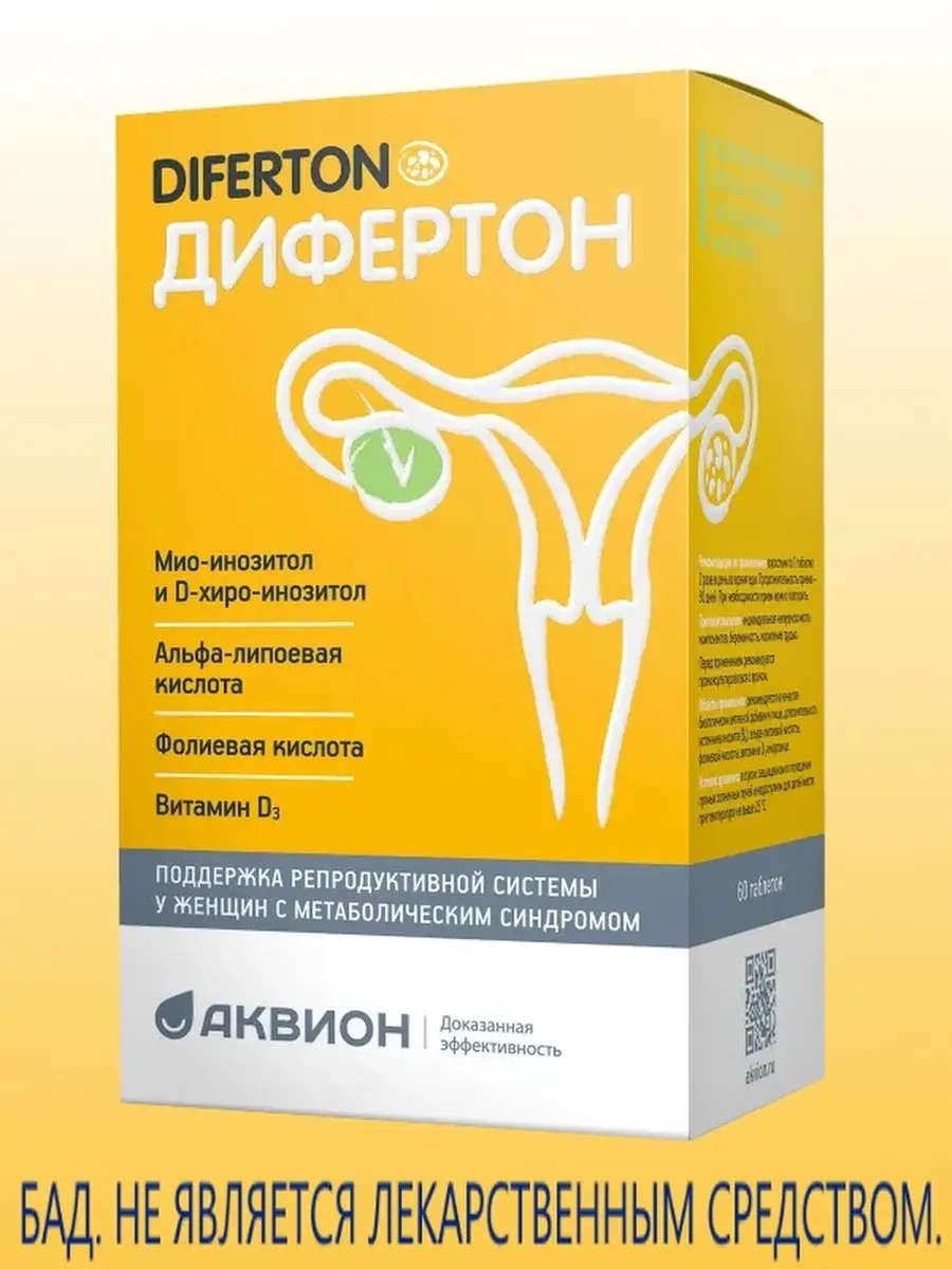 Дифертон будет полезен для восстановления овуляции и цикла при синдроме поликистозных яичников, а также для поддержки репродуктивной системы при метаболическом синдроме (одно из проявлений синдрома – диабет). В составе – естественная для человека комбинация двух форм инозитола в соотношении 40:1, альфа-липоевая кислота, фолиевая кислота, а также марганец и витамин D3.Метаболический синдром и поликистозные яичники тесно связаны между собой: при метаболическом синдроме нарушается чувствительность клеток к инсулину и растет его уровень в крови. Высокая выработка инсулина смещает гормональный баланс, увеличивают долю андрогенов, из-за чего ухудшается работа яичников, разрыв созревшего фолликула не происходит. Все это снижает вероятность забеременеть.Дифертон содержит инозитол, который улучшает восприимчивость клеток к инсулину, нормализует состояние яичников, улучшает качество яйцеклеток, необходим для овуляции. Альфа-липоевая кислота способствует нормализации уровня инсулина, необходима для правильного созревания фолликулов. Фолиевая кислота, витамин D3 и марганец улучшают обмен веществ, приближая его к нормальному.Как принимать Дифертон? Взрослым по 1 таблетке 2 раза в день во время еды. Важно: Дифертон нельзя запивать кофе, чаем или другими напитками с кофеином, так как кофеин блокирует усвоение инозита. Между приемом ДИфертона и кофеинсодержащими напитками должно пройти не менее 1-1,5 часа.Продолжительность приема – 30 дней. При необходимости прием можно повторить. Эффект следует оценивать через 3 месяца приема, специалисты нередко рекомендуют курс 6 месяцев, так как восстановление нормального обмена веществ и гормонального фона требует длительного времени.Инозит: 1127,6 мг (226 %), в том числе мио-инозитол – 1100 мг, D-хиро-инозитол – 27,6 мг; альфа-липоевая кислота – 75 мг (250 %), фолиевая кислота – 600 мкг (300 %), холекальциферол (витамин D3 – 10 мкг (200 %), марганец (в форме глюконата) – 5 мг (250 %). Вспомогательные вещества: целлюлоза, полиэтиленгликоль, мальтодекстрин, гидроксипропилметилцеллюлоза, магниевая соль стеариновой кислоты, кремния диоксид аморфный, стабилизатор – кроскарамеллоза натрия, агент антислеживающий – тальк.