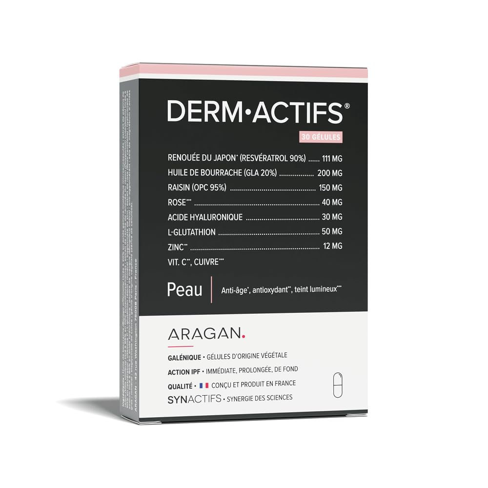 DISCOVER IN ASSOCIATION WITH DERMACTIFS: you can combine DERMACTIFS with ZINCACTIFS to fight against imperfections. USE: The recommended use of the Dermactifs d'Aragan Anti-Aging and Antioxidant food supplement based on borage oil, vitamin C, Japanese knotweed, zinc and copper is 1 to 2 capsules per day. To be taken with a glass of water. This pack contains 30 capsules, or 15 days to 1 month of intake. Our Dermactifs food supplement is made in France in Vendée. A COMPLEX OF RECOGNIZED ACTIVE INGREDIENTS: Japanese knotweed protects the skin from the signs of aging. It is combined with zinc, copper, rose and borage oil for a luminous effect on the complexion. Vitamin C will protect cells from oxidative stress. This complex acts as a natural antioxidant for your skin. A RADIANT COMPLEXION: Our Dermactifs dietary supplement helps give your skin a new youthfulness and acts as an anti-aging and natural antioxidant. Its natural formula composed of borage oil, Japanese knotweed, vitamin C, zinc and copper has a beneficial effect on the complexion's radiance and is suitable for all age groups. ANTI-AGING FOOD SUPPLEMENT: Aragan's Dermactifs dietary supplement helps prevent skin aging and protect cells from oxidative stress thanks to Japanese knotweed, borage oil, vitamin C, and zinc. Its formula acts as a natural antioxidant that allows your skin to stay in shape.A DECOUVRIR EN ASSOCIATION AVEC DERMACTIFS : vous pouvez associer DERMACTIFS avec ZINCACTIFS pour lutter contre les imperfections. UTILISATION: La préconisation d'utilisation du complément alimentaire Dermactifs d'Aragan Anti-Age et Antioxydant à base d'huile de bourrache, vitamine C, renouée du Japon, zinc et cuivre est de 1 à 2 gélules par jour. A prendre avec un verre d'eau. Ce pack contient 30 gélules soit 15 jours à 1 mois de prise. Notre complément alimentaire Dermactifs est fabriqué en France en Vendée. UN COMPLEXE D'ACTIFS RECONNUS: La renouée du Japon préserve la peau des signes de l'âge. Elle est associée au zinc, au cuivre, à la rose et à l'huile de bourrache pour un effet lumineux sur le teint. La vitamine C va protéger les cellules du stress oxydatif. Ce complexe agit comme un antioxydant naturel pour votre peau. UN TEINT LUMINEUX : Notre complément alimentaire Dermactifs participe à donner une nouvelle jeunesse à votre peau et agit comme un anti-âge et un antioxydant naturel. Sa formule naturelle composée d'huile de bourrache, de renouée du Japon, de vitamine C, zinc et cuivre a un effet favorable sur l'éclat du teint et convient à toutes les tranches d'âge. COMPLEMENT ALIMENTAIRE ANTI-AGE : Le complément alimentaire Dermactifs d'Aragan contribue à prévenir le vieillissement de la peau et à protéger les cellules du stress oxydatif grâce à la renouée du Japon, à l'huile de bourrache, à la vitamine C, et au zinc. Sa formule agit comme un antioxydant naturel qui permet à votre peau de se maintenir en forme.
