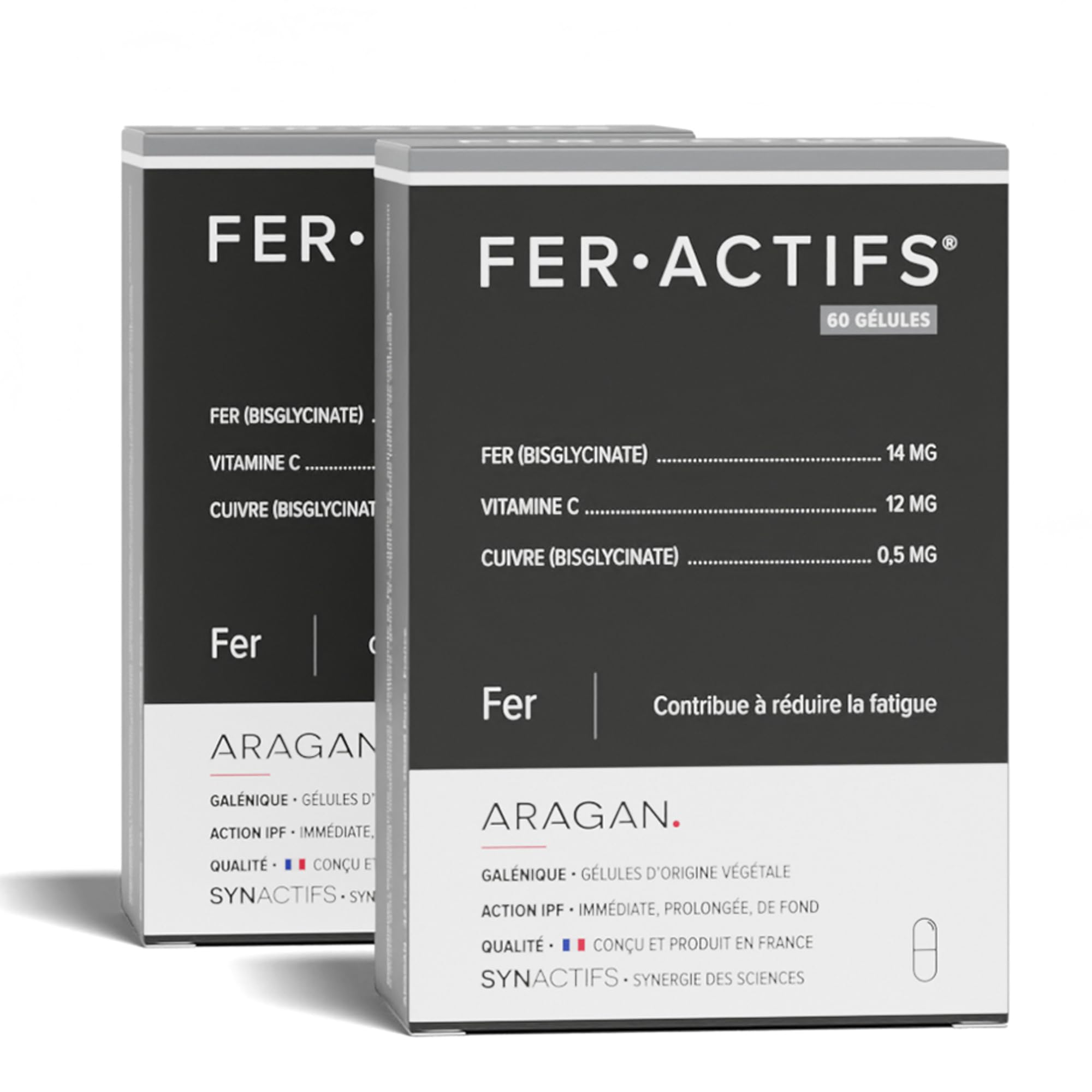 DISCOVER IN ASSOCIATION WITH FERACTIFS: For enhanced action against fatigue, you can combine FERACTIFS with LIPOSO-C ACTIFS for an energizing action, or with DYNACTIFS for more tone. USE: The recommended use of the Aragan Feractifs food supplement based on iron bisglycinate, copper and vitamin C is 1 capsule per day. To be taken with a glass of water. This pack contains 120 capsules, or 4 months of intake. Our Feractifs food supplement is made in France in Vendée. IRON, A KEY ACTIVE INGREDIENT: The benefits of iron in the body are proven. A trace element essential for the proper functioning of the metabolism, it is used to reduce fatigue. An iron deficiency can cause anemia, chronic fatigue or even dizziness. Our food supplement offers a bisglycinate form for optimal bioavailability. The combination with copper helps transport iron in the body. TO FACE FATIGUE: Our dietary supplement focuses on iron, copper bisglycinate, and vitamin C, known for their boosting effect on tone and vitality. Ideal for your body in cases of fatigue. TONE AND VITALITY FOOD SUPPLEMENT: Aragan's Feractifs dietary supplement helps reduce physical and nervous fatigue thanks to iron bisglycinate, vitamin C, and copper bisglycinate.A DECOUVRIR EN ASSOCIATION AVEC FERACTIFS: Pour une action renforcée contre la fatigue, vous pouvez associer FERACTIFS à LIPOSO-C ACTIFS pour une action dynamisante, ou encore au DYNACTIFS pour plus de tonus. UTILISATION: La préconisation d'utilisation du complément alimentaire Feractifs d'Aragan à base de fer bisglycinate, de cuivre et de vitamine C est de 1 gélule par jour. A prendre avec un verre d'eau. Ce pack contient 120 gélules soit 4 mois de prise. Notre complément alimentaire Feractifs est fabriqué en France en Vendée. LE FER, UN ACTIF CLÉ: Les bienfaits du fer dans l'organisme sont prouvés. Oligo-élément indispensable au bon fonctionnement du métabolisme, il est utilisé pour réduire la fatigue. Un déficit en fer peut provoquer de l'anémie, de la fatigue chronique où encore des vertiges. Notre complément alimentaire propose une forme bisglycinate pour une biodisponibilité optimale. L'association avec le cuivre aide au transport du fer dans l'organisme. POUR FAIRE FACE A LA FATIGUE: Notre complément alimentaire mise sur le fer, le cuivre bisglycinate et la vitamine C, reconnus pour leur effet boostant sur le tonus et la vitalité. Idéal pour votre organisme en cas de fatigue. COMPLEMENT ALIMENTAIRE TONUS ET VITALITE: Le complément alimentaire Feractifs d'Aragan contribue à réduire la fatigue physique et nerveuse grâce au fer bisglycinate, à la vitamine C et au cuivre bisglycinate.