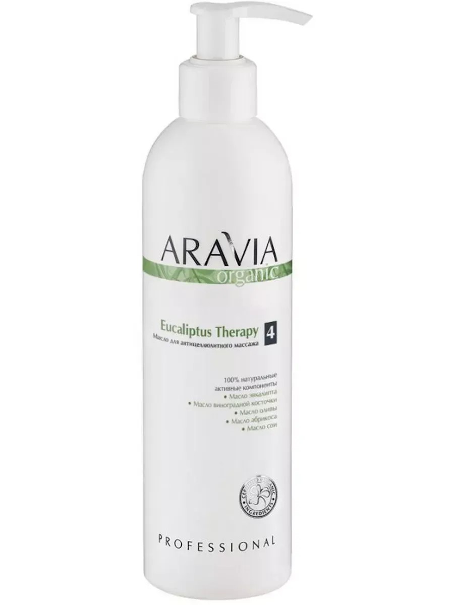 Aravia Eucaliptus Therapy Anti-Cellulite Massage Oil, 300 ml. This oil is designed for anti-cellulite and relaxing body massage. A perfectly balanced blend of natural plant oils of eucalyptus, apricot, soy, olive, and grapeseed has a beneficial effect on the skin, providing nourishing, restorative, softening, regenerating, and healing properties. Massage with this oil stimulates blood circulation, promotes lipolysis, and improves tissue fluid drainage. The oil's light texture absorbs quickly, yet provides excellent glide for a long massage. The aromatic composition has a relaxing and deodorizing effect, helping to improve mood. Recommended use: anti-cellulite and relaxing massage, spa treatments, stone therapy. Ingredients: Glycine Soja (Soybean) Oil, Olea Europaea (Olive) Fruit Oil, Vitis Vinifera (Grape) Seed Oil, Prunus Armeniaca Kernel Oil, Eucalyptus globulus Leaf Oil, Parfum.