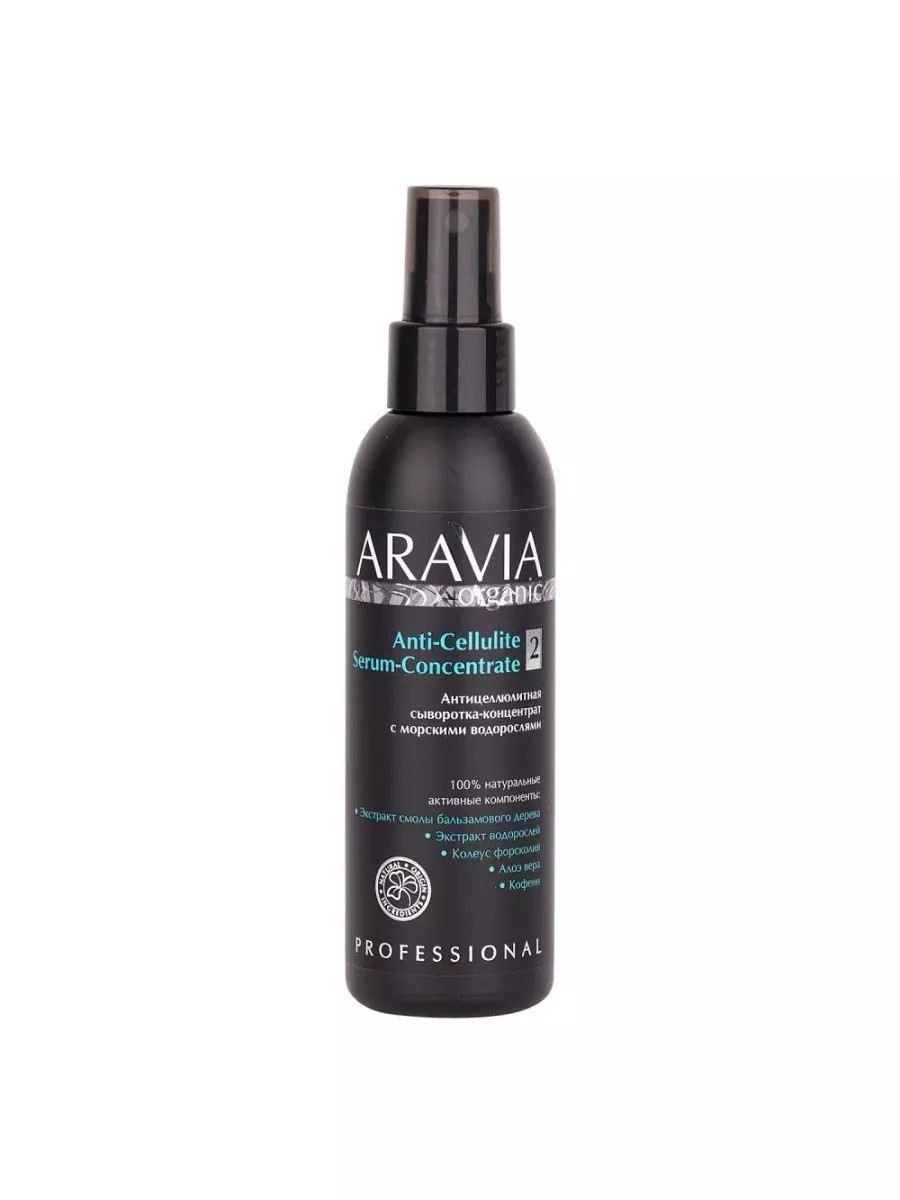 Интенсивная сыворотка-концентрат на основе экстракта морских водорослей и эффективно подобранных липолитических активов создана для целенаправленной борьбы с целлюлитом любой стадии и уменьшения объемов тела. Быстро впитывается, не липнет. Назначение: борьба с целлюлитом и уменьшейние объемов тела. Рекомендации для использования: применять в процедурах обертывания, массажа (под массажное средство), в качестве регулярного поддерживающего ухода при наличии показаний. Разбрызгать на проблемные участки тела (бедра, живот), равномерно распределить мягкими круговыми движениями. Дать полностью впитаться. Не смывать. В домашнем уходе рекомендуется применять как самостоятельное средство или в сочетании с продуктами из Антицеллюлитной программы Aravia Organic курсом в течение 30 дней. Наносить 2 раза, утром и вечером. Возможно ощущение легкого разогревающего эффекта. Для наибольшей эффективности рекомендуется использовать в антицеллюлитной программе совместно с продуктами: Антицеллюлитный скраб с вулканической глиной Anti-Cellulite Vulcanic Scrub Aravia Organic Антицеллюлитная солевая крем-маска для тела Anti-Cellulite Salt-Intensive Mask Aravia Organic Контрастный антицеллюлитный гель для тела с термо и криоэффектом 2 в 1 Anti-Cellulite Ice amp;Hot Body Gel Aravia Organic Примечание: перед первым применением протестируйте средство на небольшом участке кожи, чтобы исключить индивидуальную непереносимость компонентов.