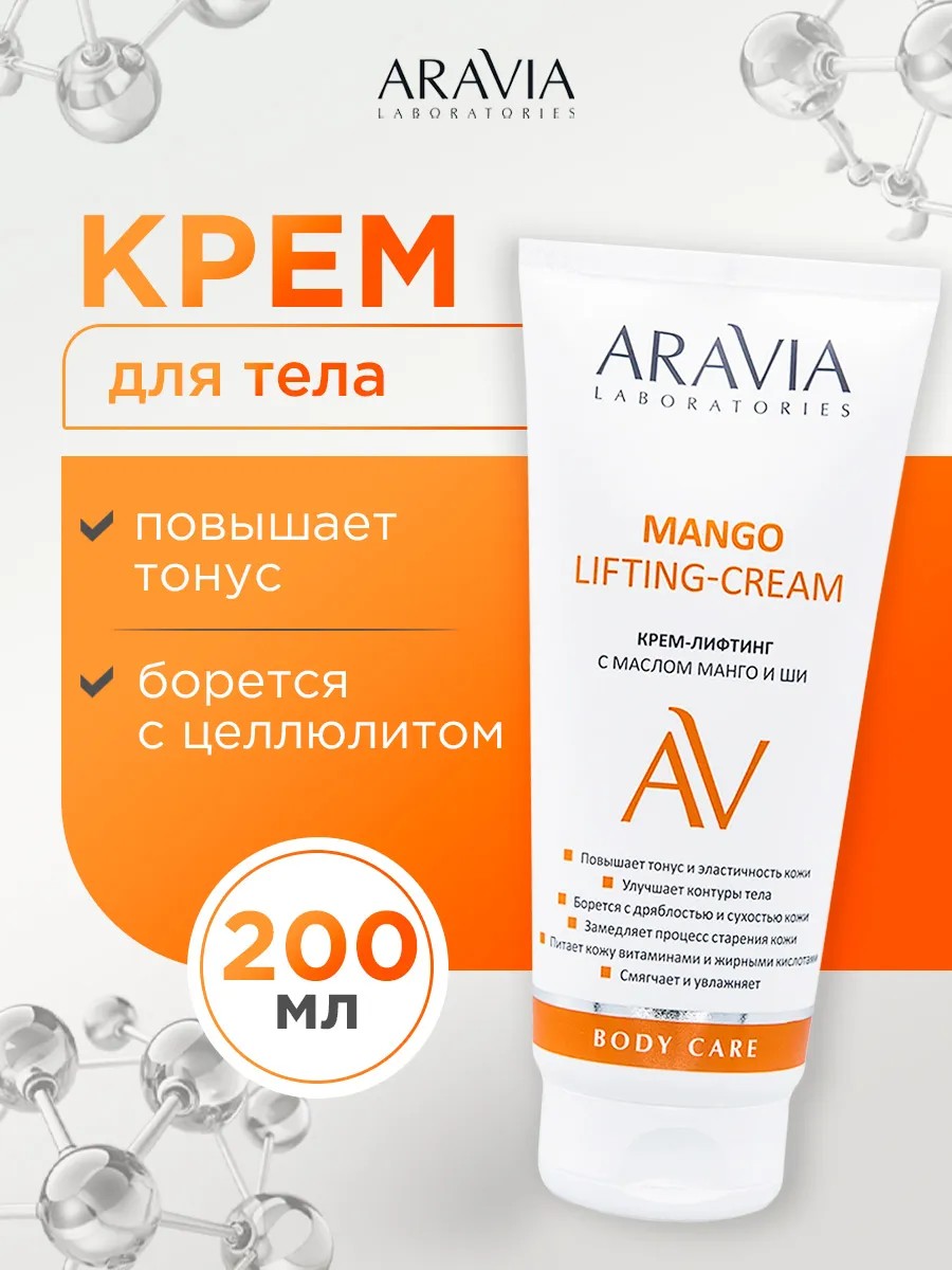 ARAVIA Laboratories Крем-лифтинг с маслом манго и ши Mango Lifting-Cream 200мл. Питательный крем для тела с выраженным лифтинг-эффектом. Нежная текстура крема, насыщенная натуральными маслами, комплексно ухаживает за кожей, наполняя ее полезными витаминами и жирными кислотами. Стимулируя выработку собственного коллагена, крем значительно повышает тонус и эластичность кожи, способствуя лифтинговому действию и устранению дряблости. Благодаря активному составу обеспечивает антиоксидантную защиту и борется с фотостарением. Применение крема делает кожу мягче и обеспечивает длительное чувство увлажненности, устраняя сухость и чувство стянутости. Крем подарит коже приятный аромат спелого манго. Назначение: для ежедневного ухода при атоничной коже, сухости кожи и во время похудения. Биоактивный состав: масло манго, масло ши, масло оливы, масло какао, коллаген, аллантоин. Масло манго — восстанавливает, защищает, тонизирует, смягчает, отбеливает, отшелушивает и укрепляет кожу. Масло манго эффективно в борьбе с целлюлитом, придает лифтинг-эффект. Масло ши — обладает выраженным антиоксидантным действием, стимулирует замедлившиеся процессы метаболизма увядающей кожи и регенерацию клеток. Масло оливы — увлажняет, питает, делает кожу более бархатистой. Повышает упругость кожи. Убирает сухость и обезвоженность. Масло какао — эффективно борется с первыми проявлениями старения, питает и увлажняет кожу, улучшает внешний вид кожи. Коллаген — делает кожу упругой и эластичной. Аллантоин — способствует заживлению и восстановлению кожи, оберегает от негативного действия свободных радикалов и замедляет появление морщин. Снимает раздражения, успокаивает, освежает, препятствует появлению стянутости и дискомфорта. для ежедневного использования.